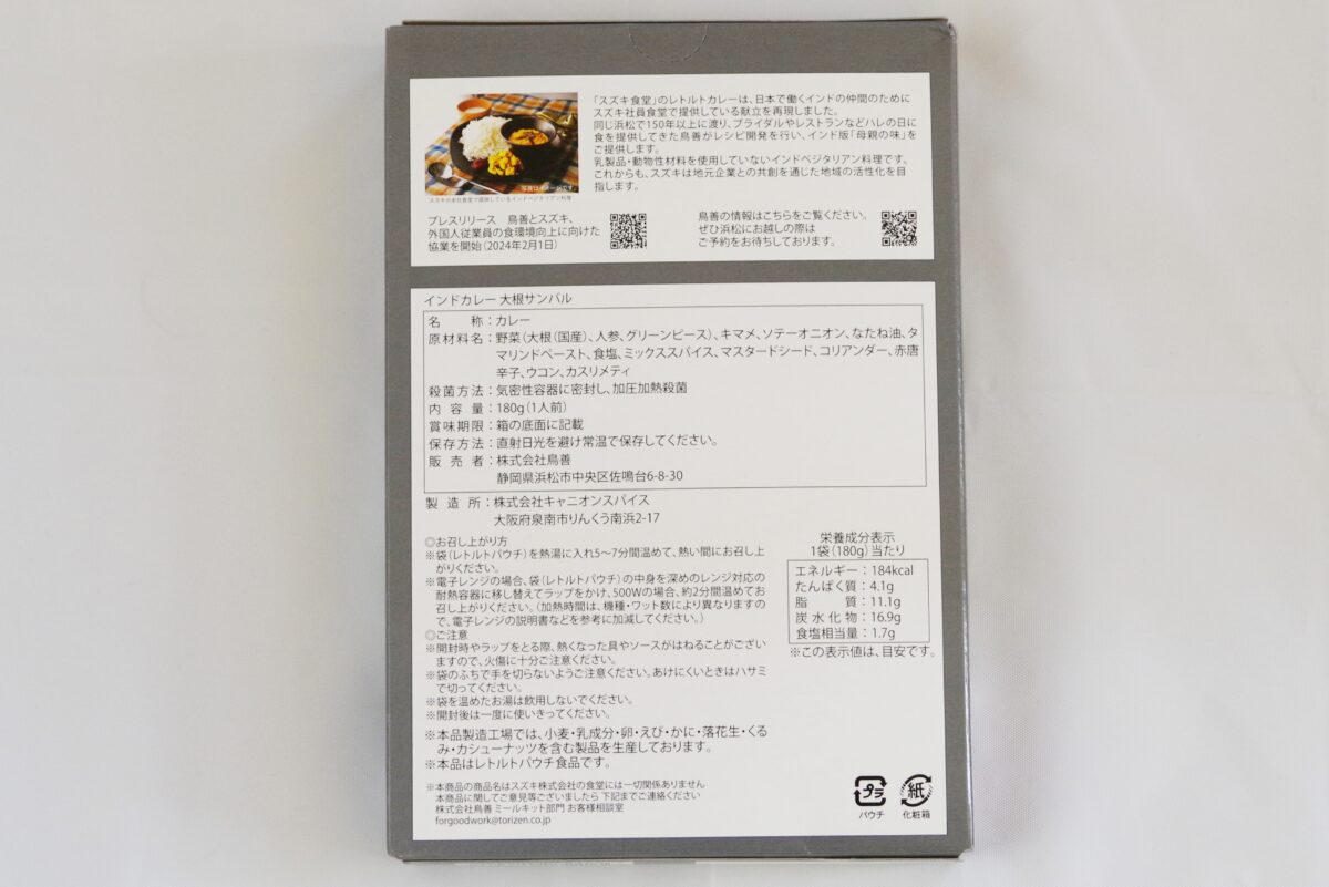 ↑原材料は、野菜(大根(国産)、人参、グリーンピース)、キマメ、ソテーオニオン、なたね油、タマリンドペースト、食塩、ミックススパイス、マスタードシード、コリアンダー、赤唐辛子、ウコン、カスリメティ。カロリーは184kcal。