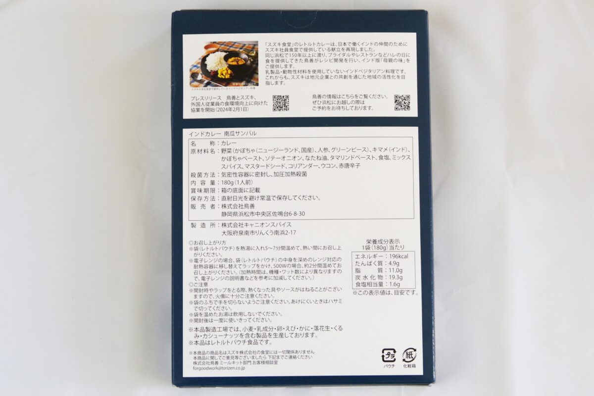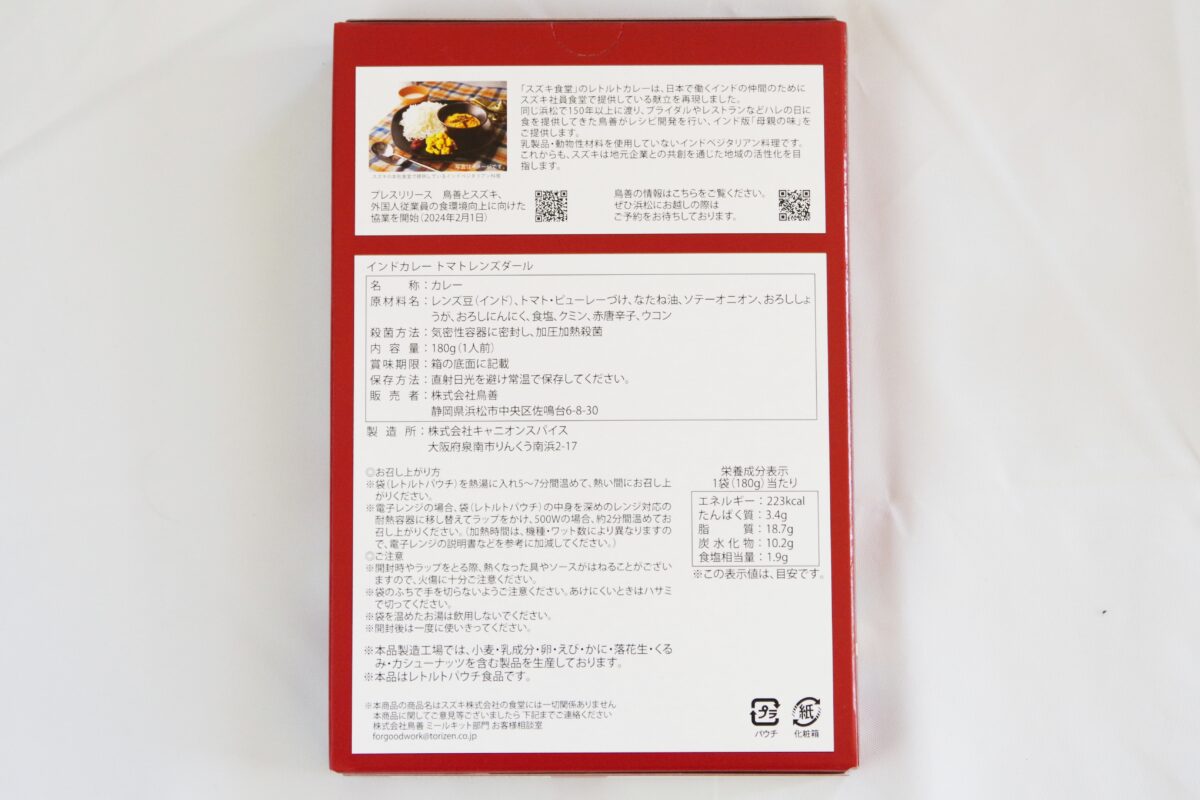 このカレー、元々はスズキ本社の社員食堂で2024年1月から提供されているメニューがベース。スズキのクルマはインドで大きなシェアを獲得しており、本社のある静岡県浜松市にも多くのインド系社員が訪れる。そこで、日本でも懐かしい「母親の味」を味わってもらうべく、本格的なインド料理の提供を開始。この献立を再現したのが今回のレトルトカレーだ。