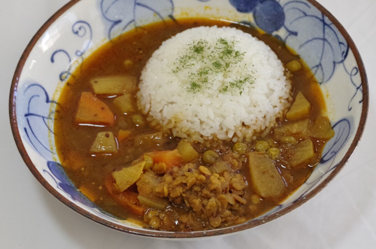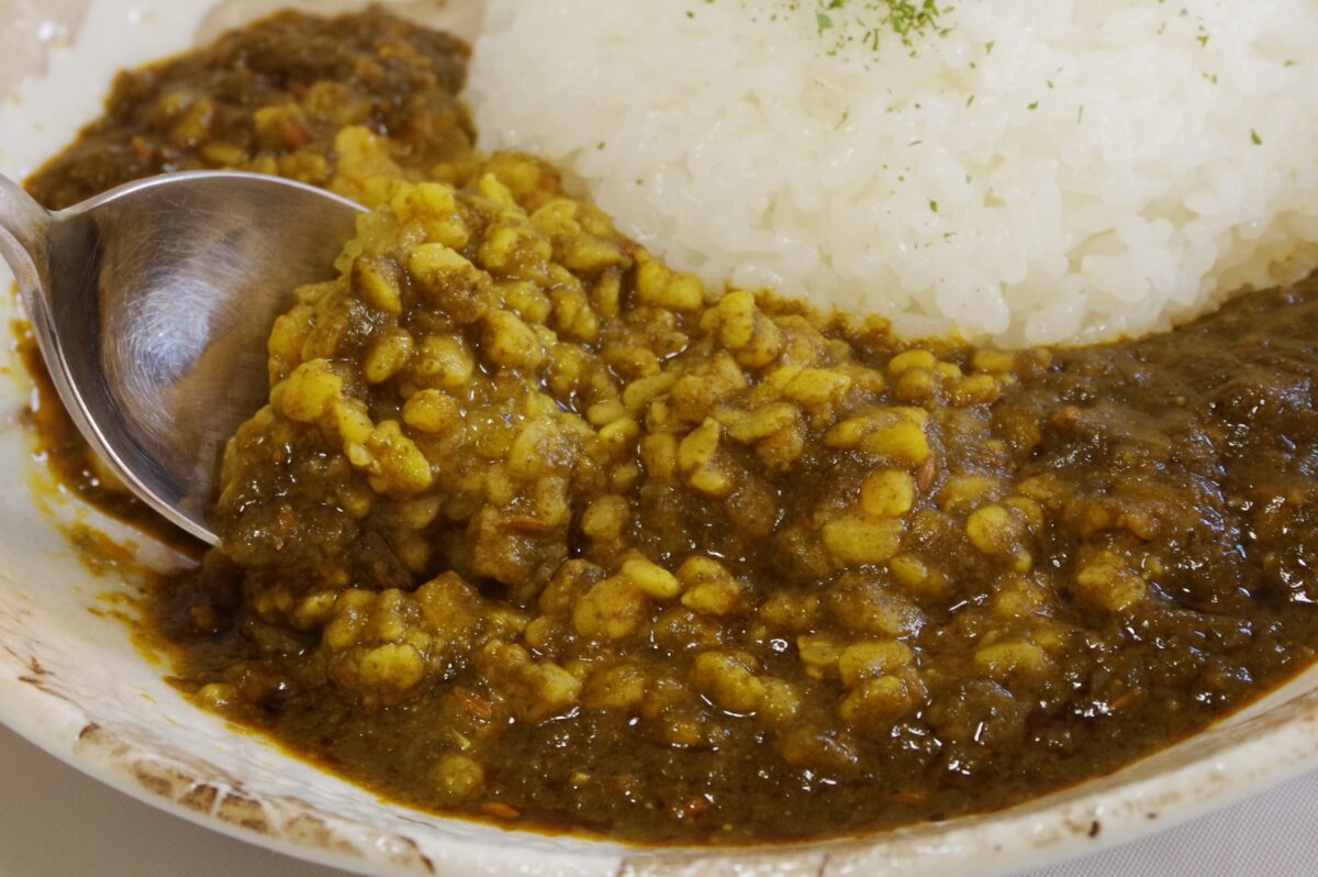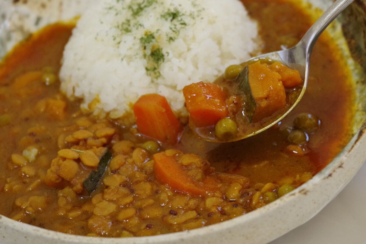 続いては「茶ひよこ豆マサラカレー」。公式HPによると、タンパク質豊富な皮付き茶ひよこ豆と、じっくり炒めた玉ねぎを合わせた北インドの煮込み料理とのこと。トマトの酸味と青唐辛子のキレのある味わいが楽しめるという。