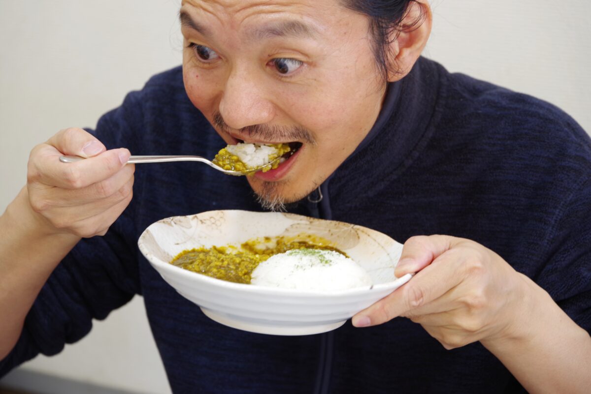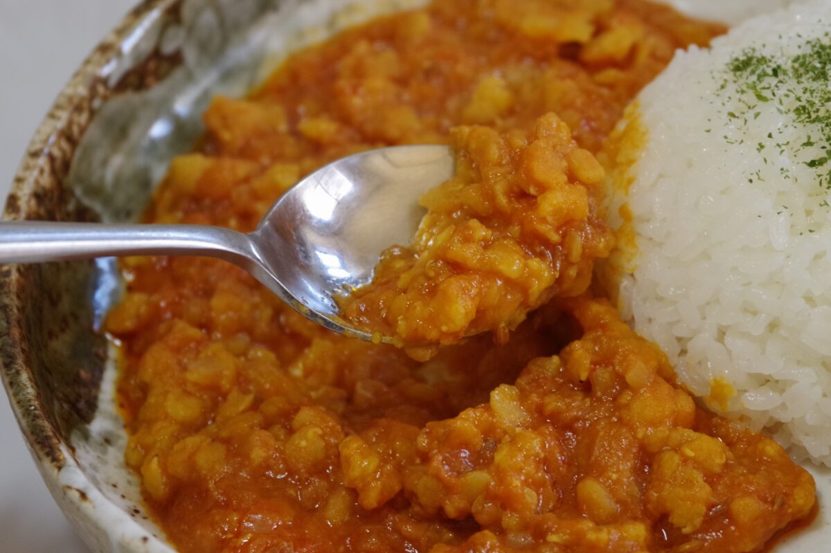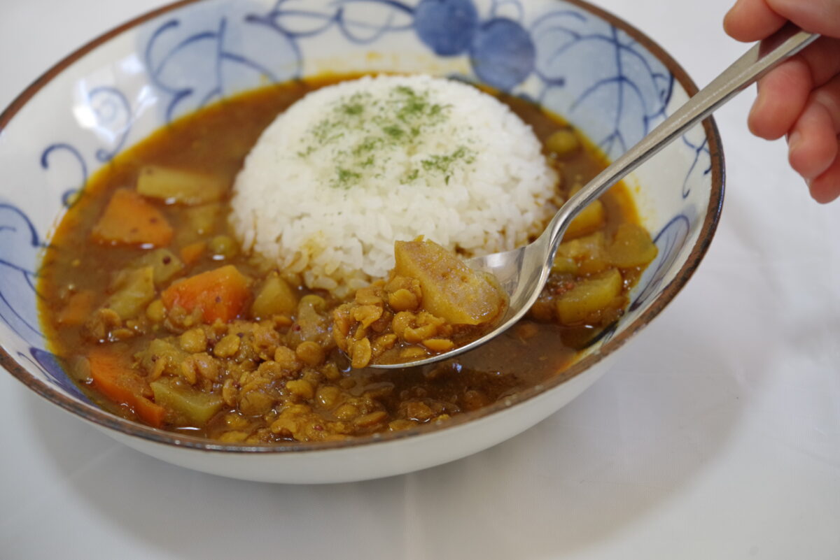 口に入れた第一印象は「甘い」。かぼちゃをはじめ、グリーンピースや油の甘みが前面に出てきた。その後、辛みを感じる。公式の辛さは「2」だけど、後味はもう少し辛い印象だ。