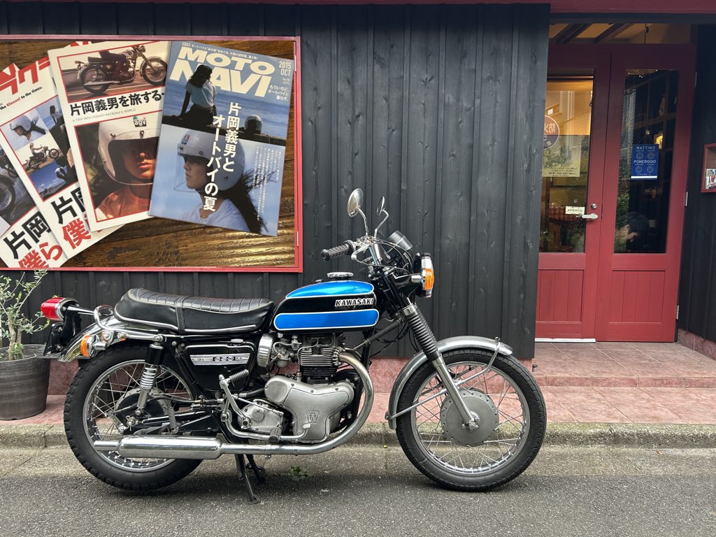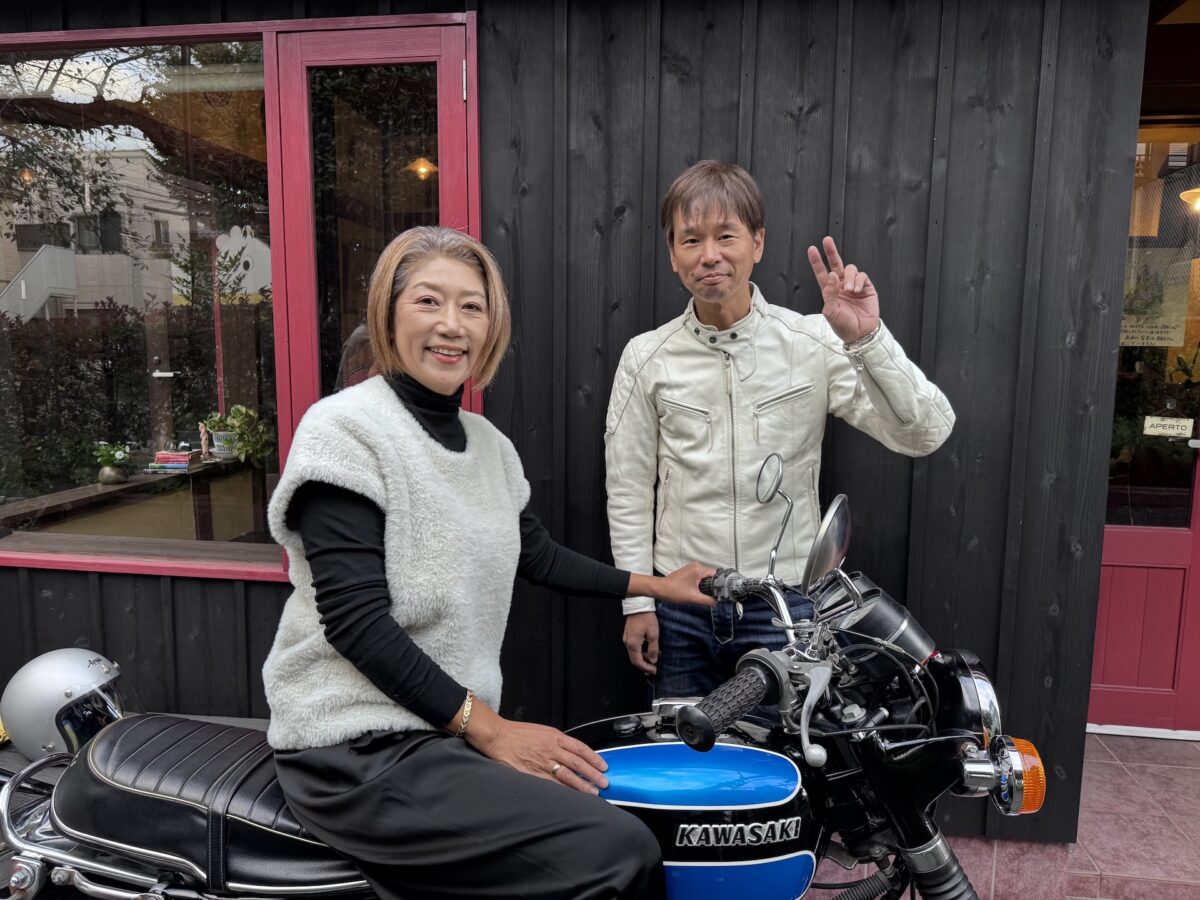 撮影時にはダブワン(カワサキW1SA/1971年式)に乗って行ったのですが、佐藤久実さんに跨っていただき、厚かましくもツーショットもおねだり。ここで自慢しておきます。