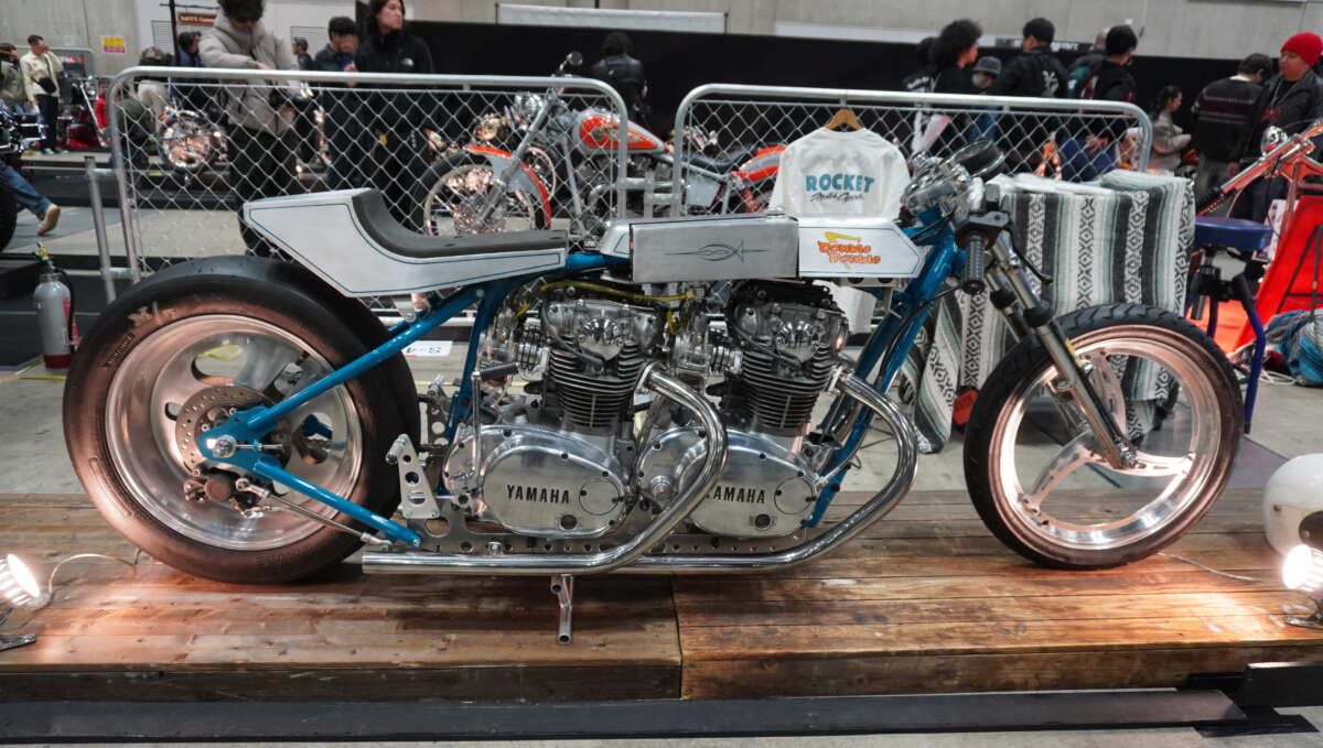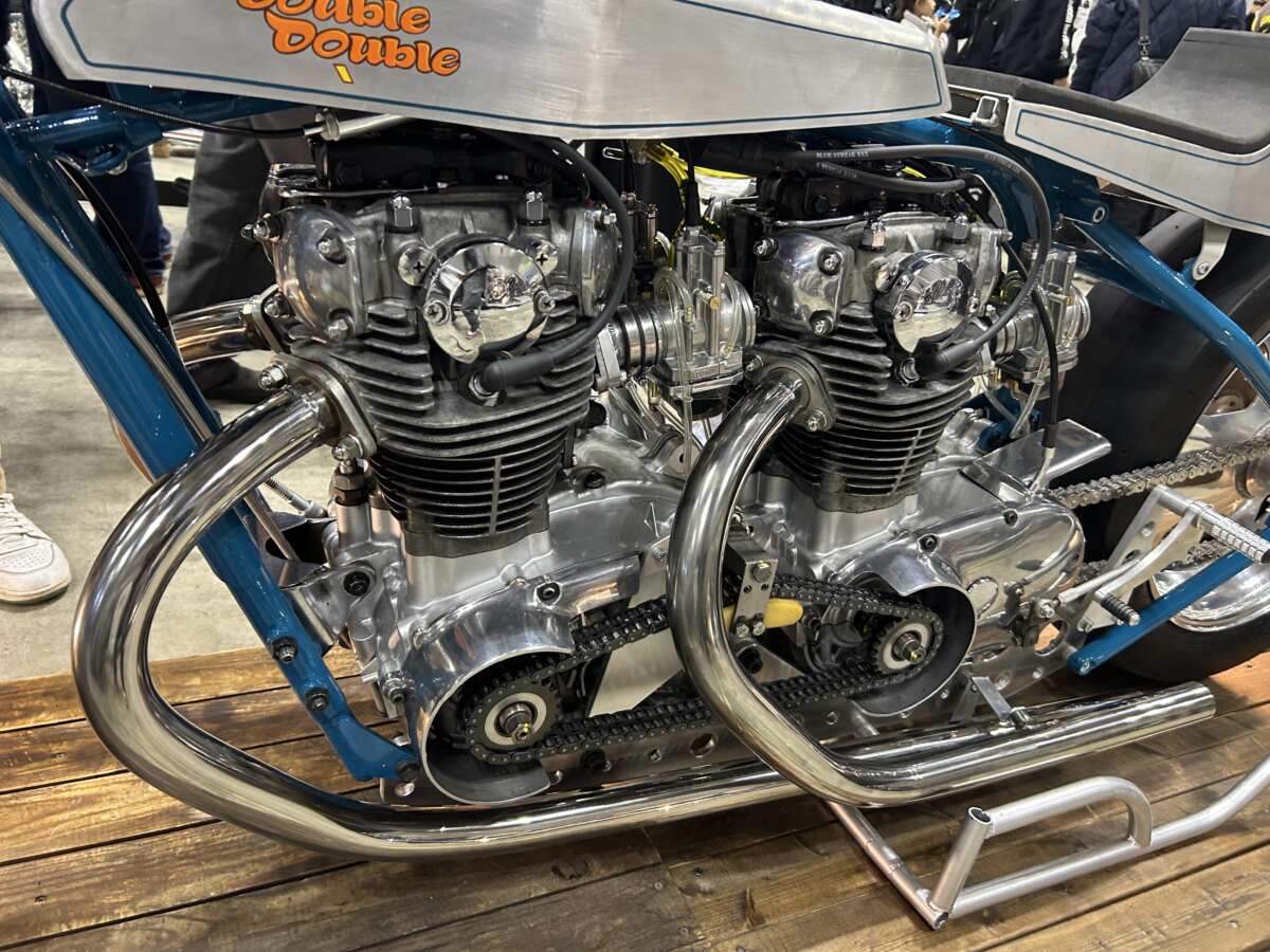 なんと、ROCKET MOTORCYCLE(ロケットモーターサイクル)は、ヤマハXS650スペシャル(1980年)のバーチカルツインエンジンを前後に2基連結! その名も『ダブルダブル』です。