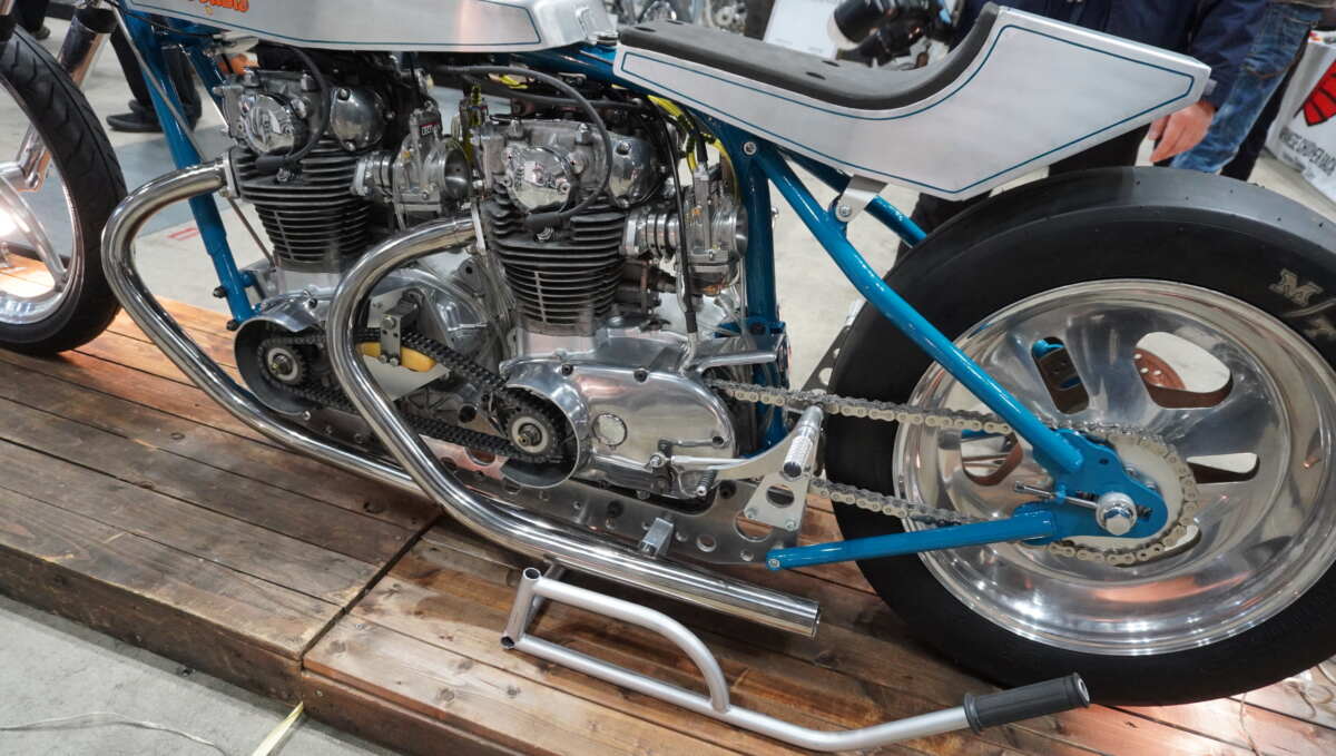 後ろ側のエンジンにトランスミッションがあり、SOHC2バルブ並列2気筒653cc×2の強烈なパワーをドラッグレース用の超ワイドタイヤを履く後輪へ伝えます。