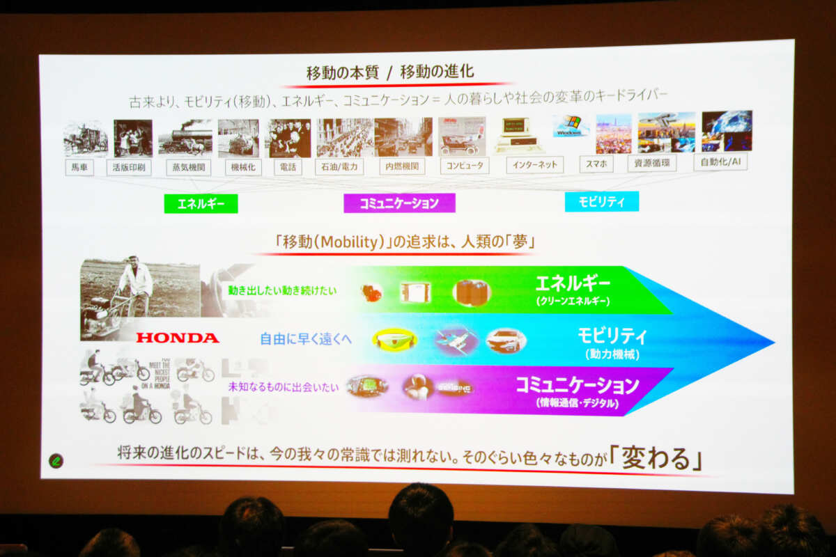 ホンダが考えるモビリティとはどういうものでしょうか? これについて三部さんは、これまでにも様々なイノベーションが起こったなかで、大きく分けると「エネルギー」「モビリティ」「コミュニケーション」の3つである、そしてこれらが融合して新しいものになっていくと説明しました。