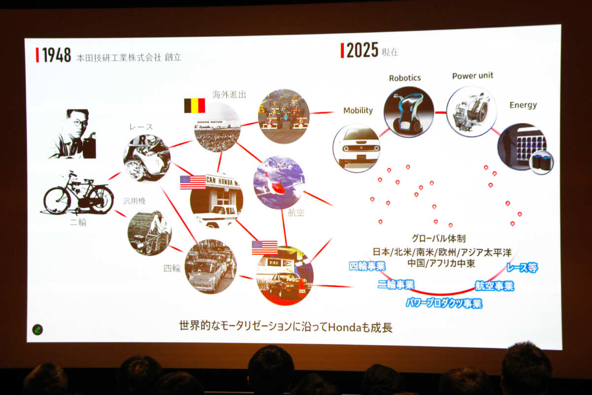 現在は、モビリティ、ロボティクス、パワーユニット、エネルギーの4つのカテゴリーからは「あまり外れないように」という方針のなか、四輪・二輪・パワープロダクツ・航空・レース等といった事業を行っています。
