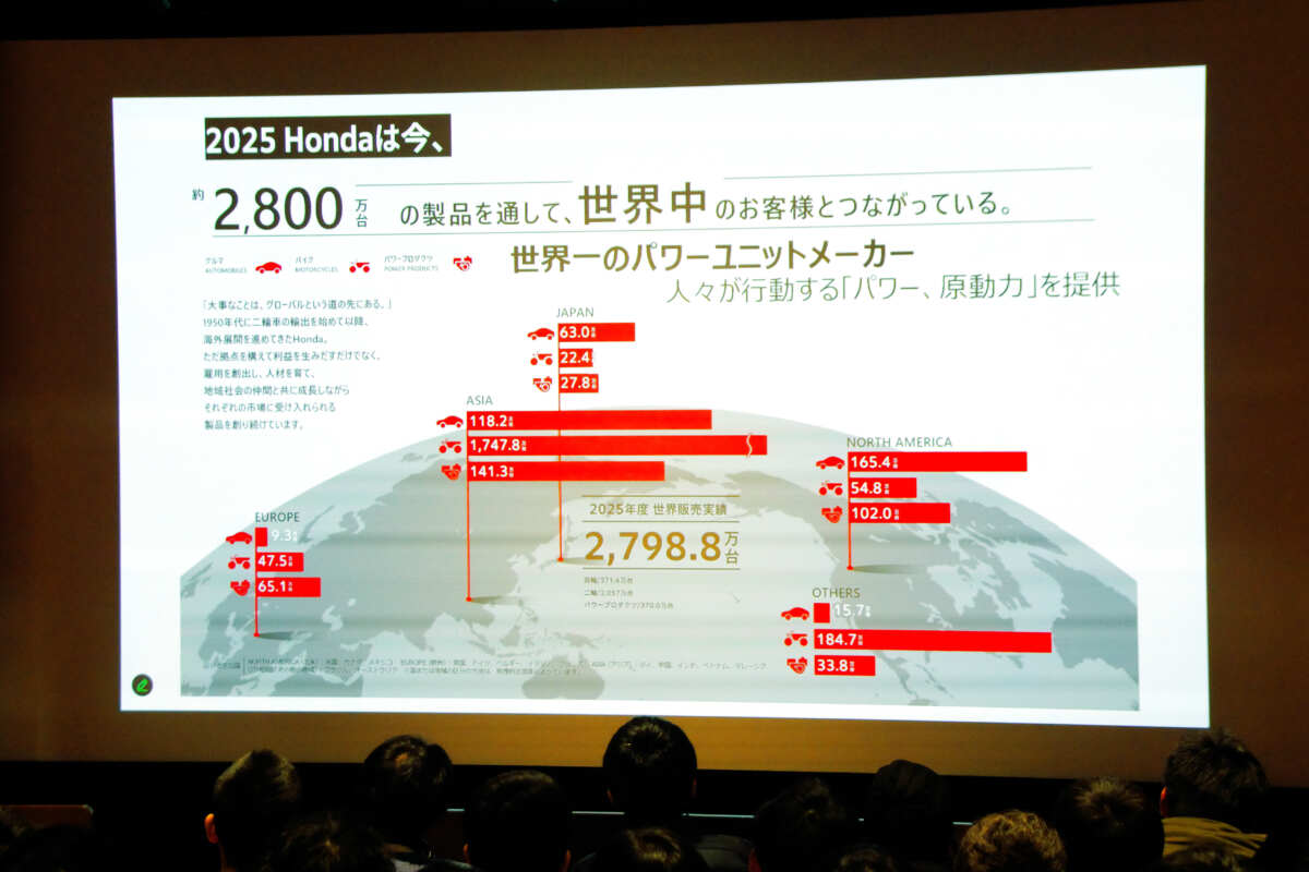 ▲2025年の世界販売位実績が2,798.8万台でした。ちなみに二輪車の販売台数は、日本で22.4万台、アジアで1,747.8万台、北米で54.8万台、その他地域で184.7万台となっています