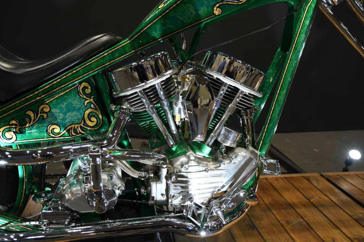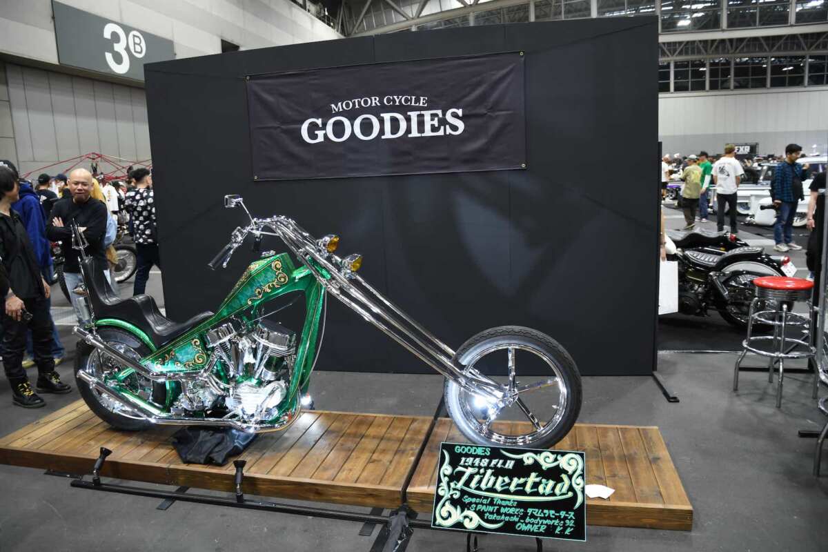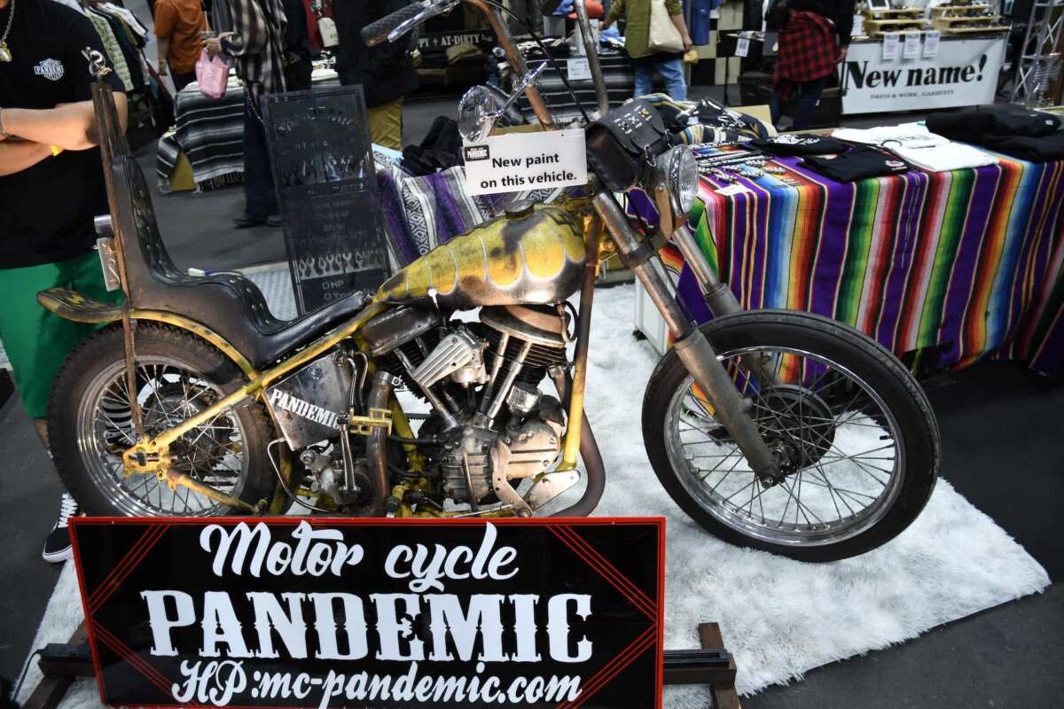 そして、普段ではなかなか見ることのできないハードコアな世界も目の当たりにできます。たとえば、「Motor Cycle PANDEMIC/モーターサイクルパンデミック」(千葉県旭市)が手掛けたチョッパー。リヤサスペンションのないリジッドフレームに積まれるVツインエンジンは、1952年式の「パンヘッド」です。