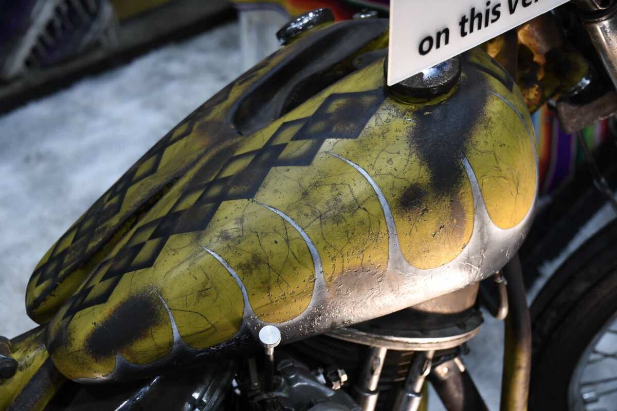 外装のみならず、フレームやオイルタンクも手の込んだペイントで仕上げられ、目を見張ります。こちらもまた、アートな世界観ではありませんか。