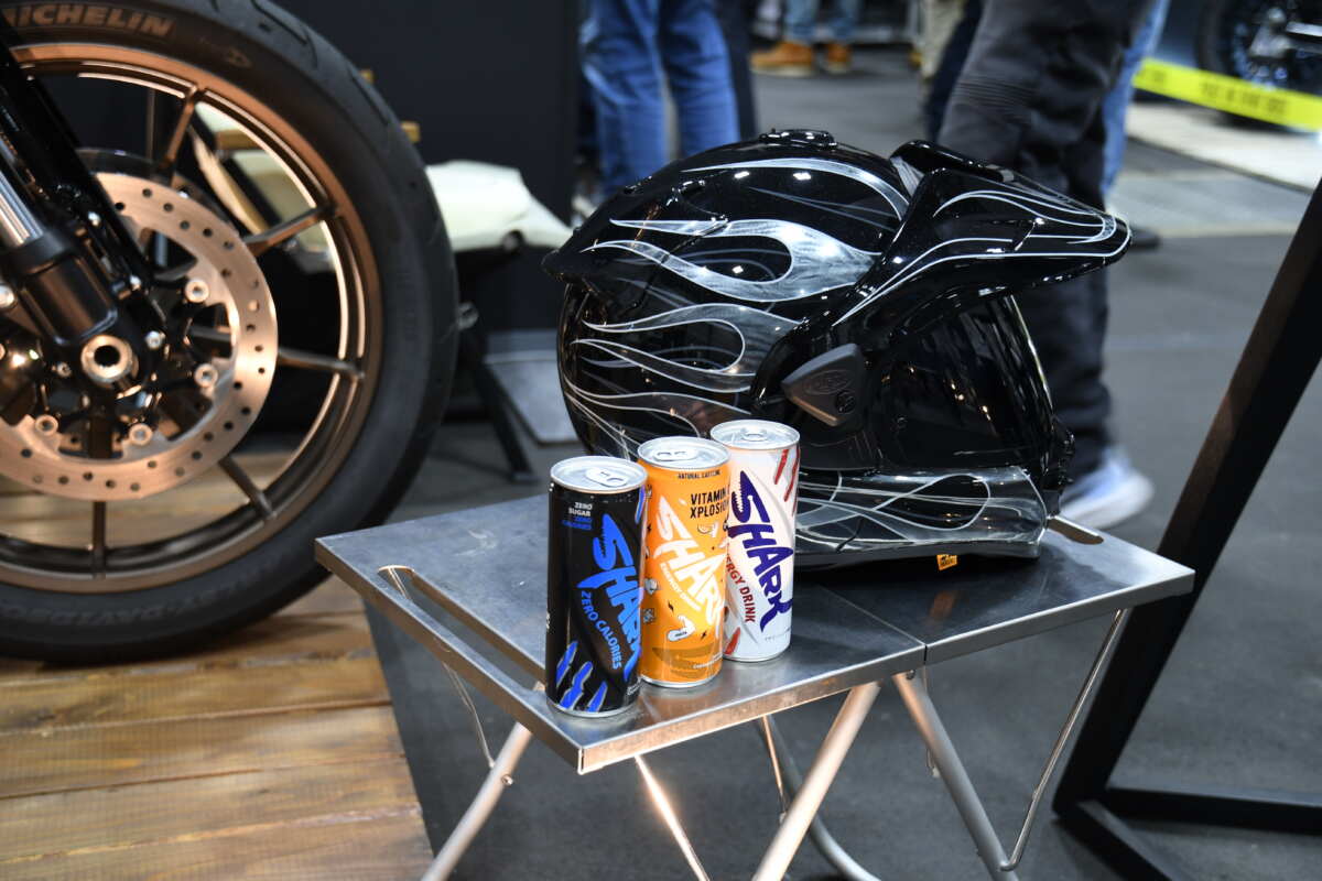バイザー付きのオフロードヘルメットもフルペイントされています。ミルウォーキーエイト117エンジンと倒立フォーク装備のパフォーマンスクルーザーでスポーツライディングし、「シャークエナジードリンク」で美味しくすっきりとエネルギー補給というストーリーをブース内で演出しています。なるほどナットク、いいですね!