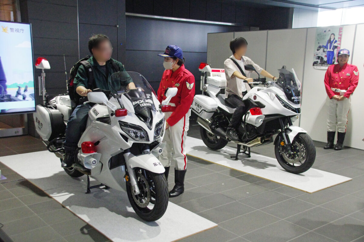 ▲警視庁の白バイ展示は毎年人気。今年は新型のNT1100P(写真奥)にもまたがることもできた