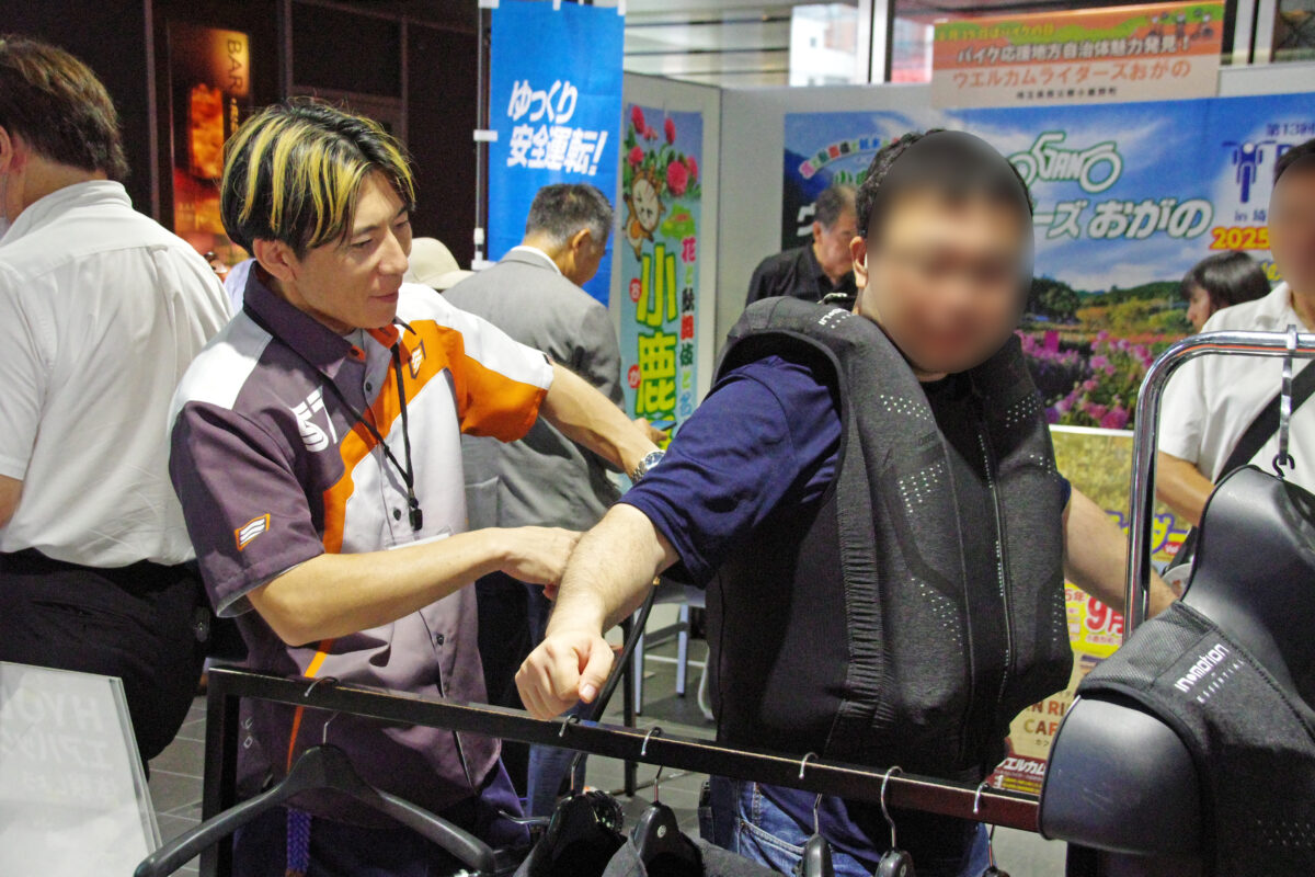 ▲ウェアメーカーのヒョウドウプロダクツはエアバッグベスト「HYOD AIR-BOOST FORCE 01」の展開体験も実施