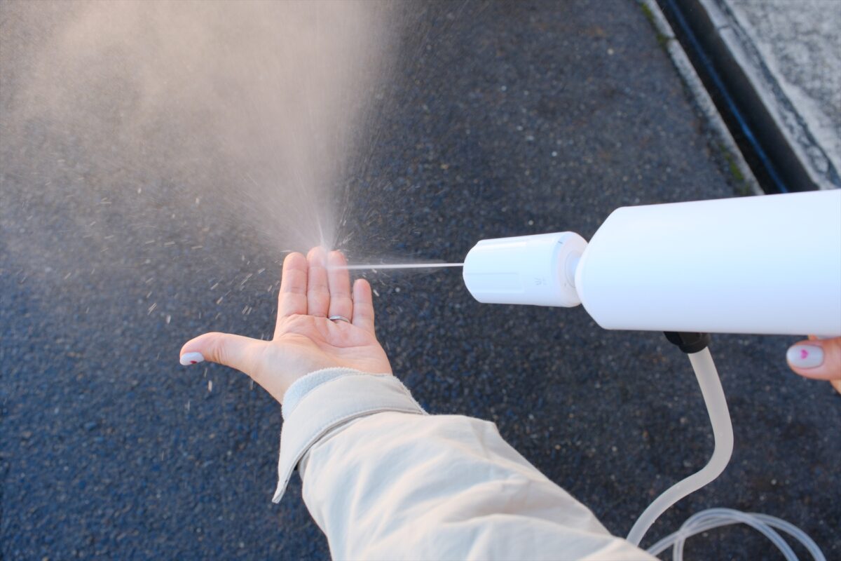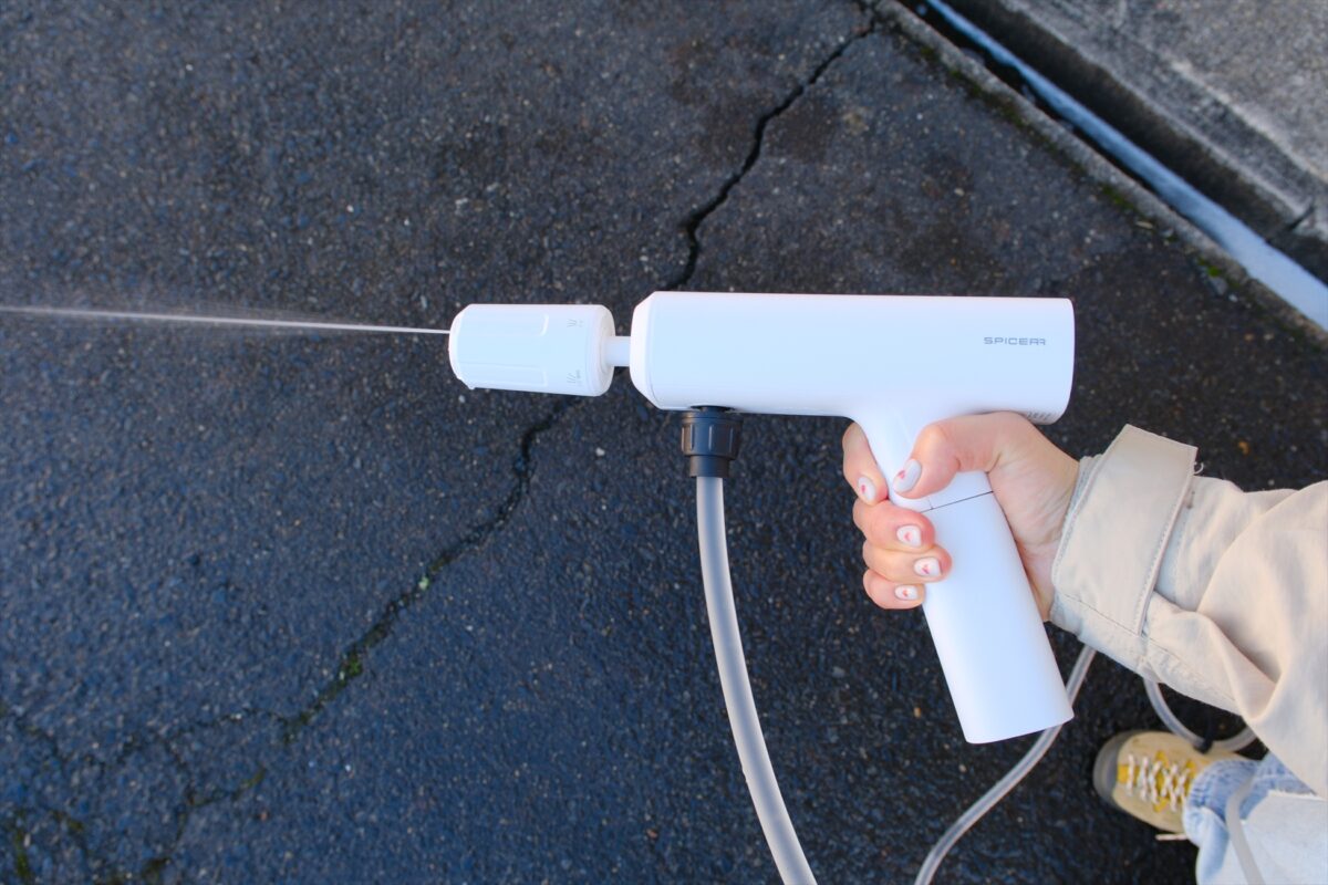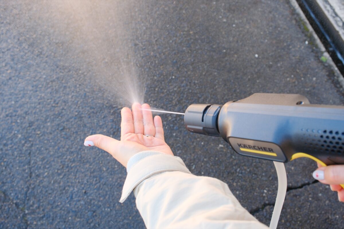 ──さて。こうして比較をしてみた結果、スパイサーとケルヒャーの水圧・水量は同じぐらいに見えました。交互に手に向けて噴射してみても、違いを感じ取ることはできません。