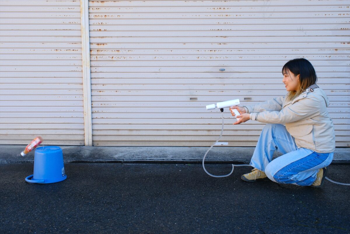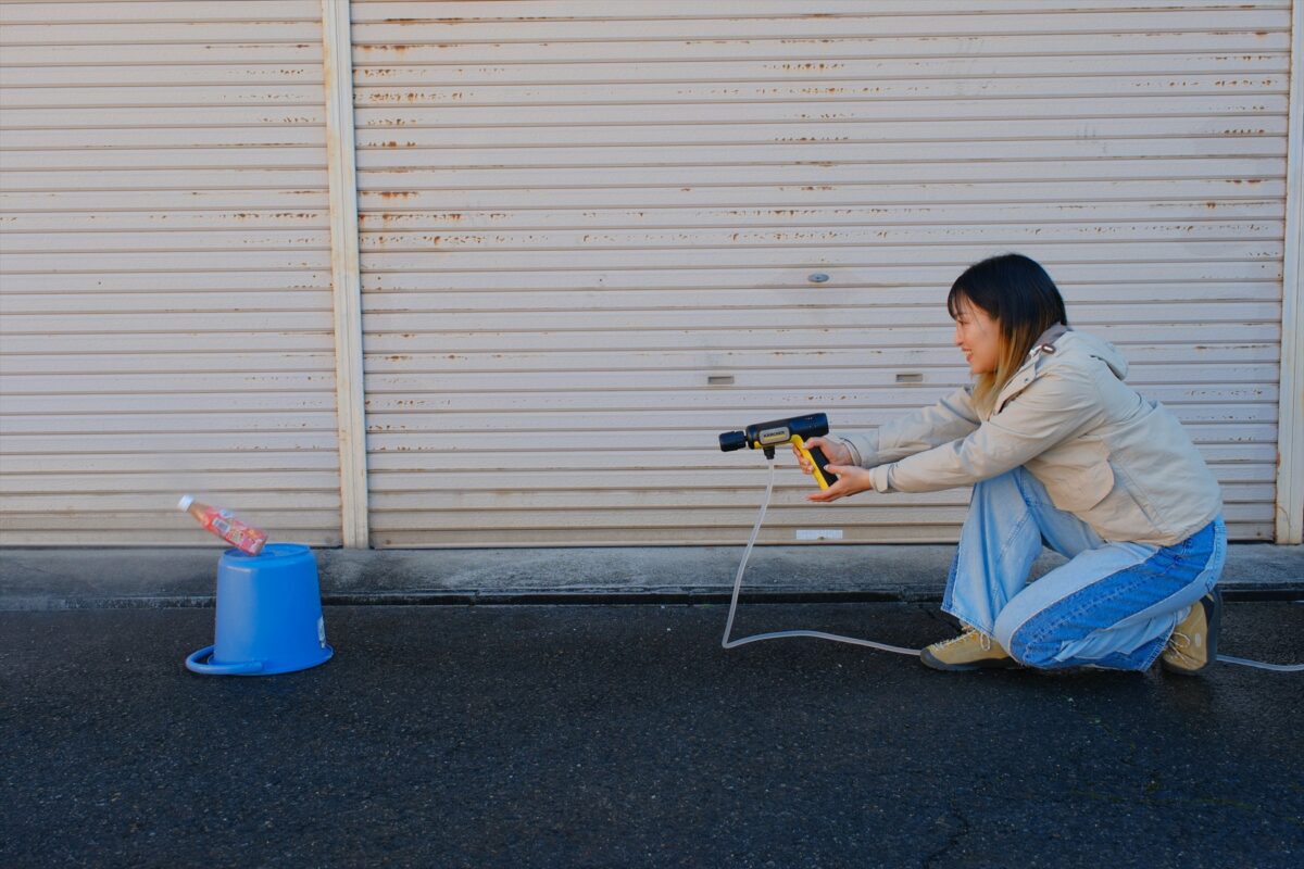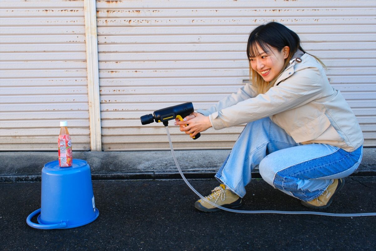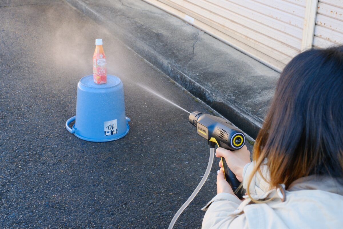 両者の噴射パターンを「0度(ポイントジェット)」、強さを「強」に設定した上で、バケツの上に立てたペットボトルを倒せるかどうかをテストします。
