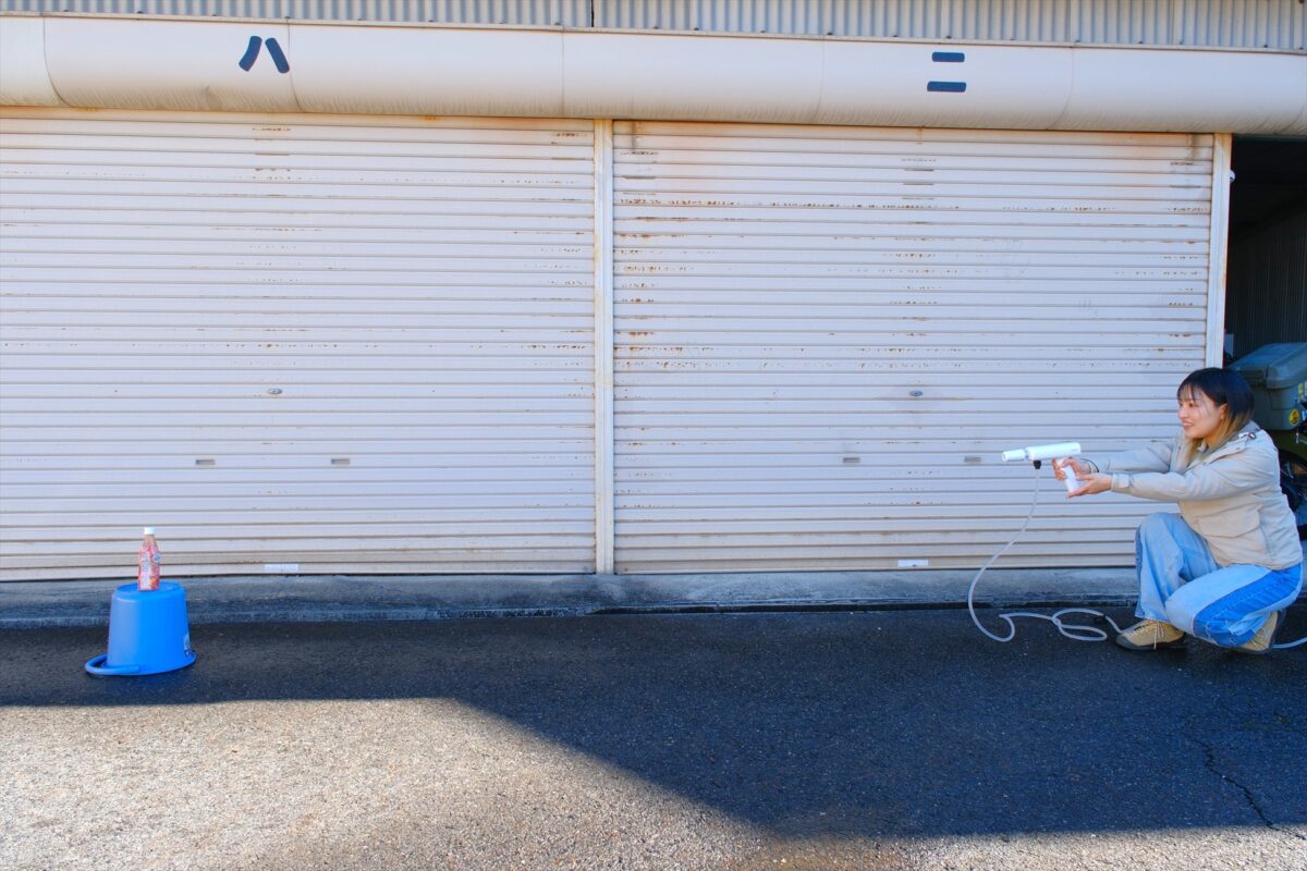 さらに距離を伸ばして3メートル離れた場所から噴射してみたところ、風で水が散らばってしまい、ペットボトルは微動だにしませんでした。