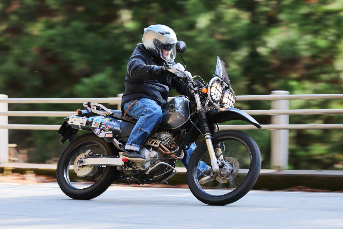 オフロードバイクというと未舗装路のイメージが強いが、軽い車体と素直なハンドリングは、舗装路でも抜群に楽しい。ヒラヒラと向きを変え、速度域も低めで済む。結果として余裕をもって走れるのがいい。