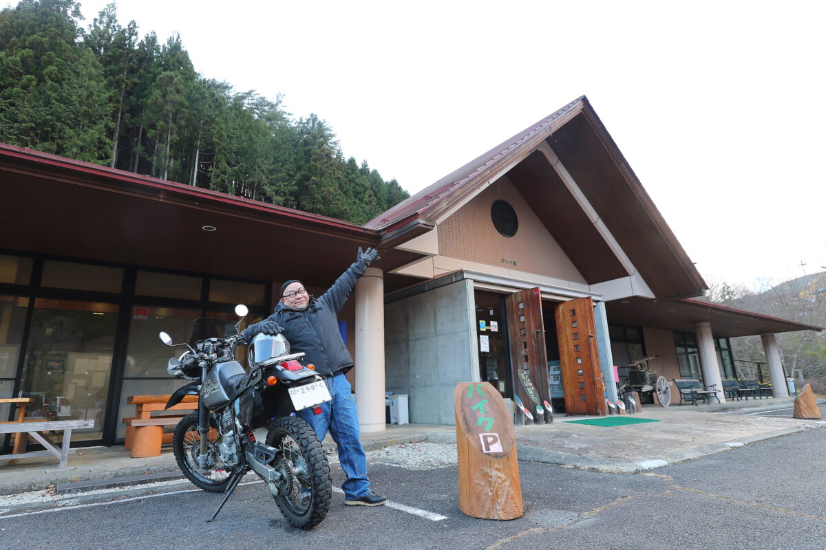山に囲まれた静かな場所で、ツーリングの立ち寄りスポットとしてちょうどいい距離感。バイク用駐車場が用意されているのも、ライダーとしてはうれしいポイントだ。