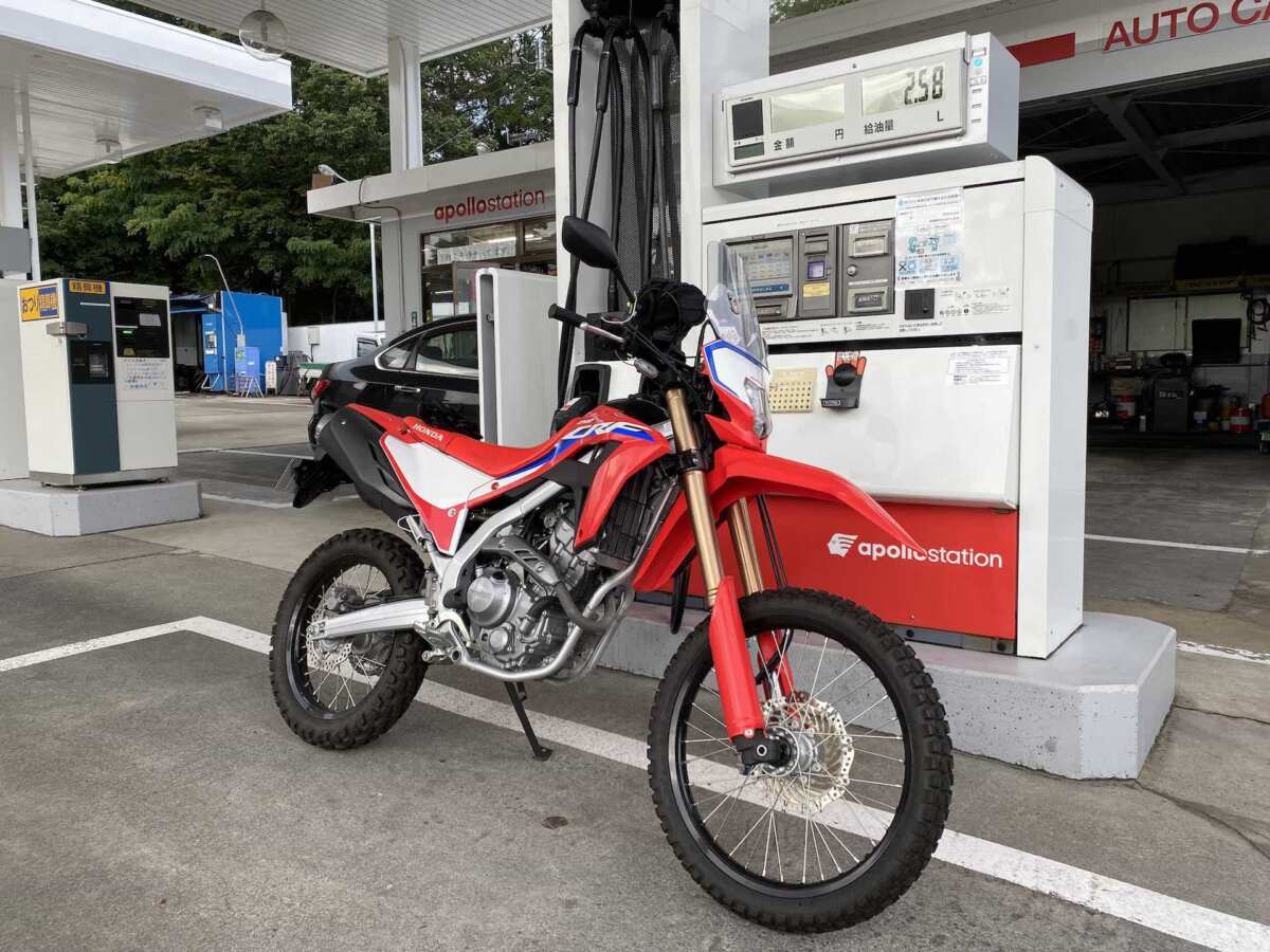 まだ朝が早く、開いているガソリンスタンドを見つけて給油しておきます。『CRF250L<S>』の燃料タンク容量は7.8リットルで、こうしてツーリングに出掛けると少なく感じます。