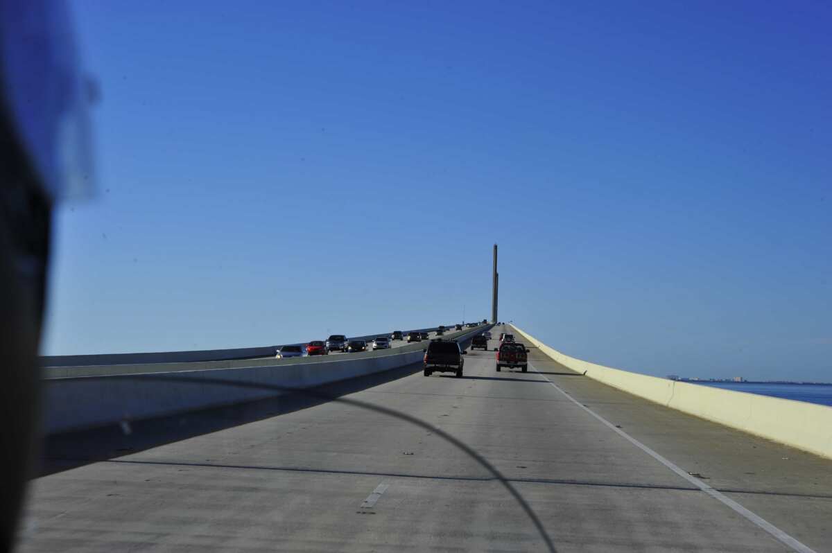 サンシャイン・スカイウェイ・ブリッジ。その最高地点へは海の上をひたすら走り、さらに空高く目指して上り坂を少しずつ少しずつ登るといった感覚です。