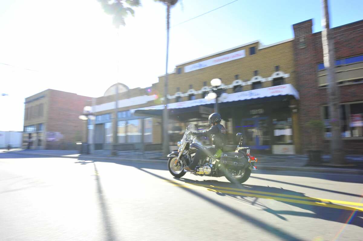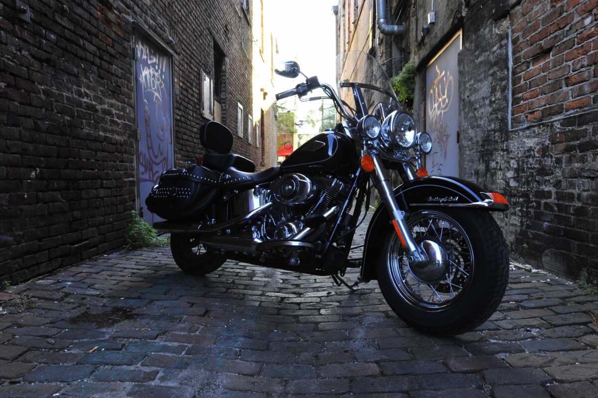 こんなしっとりとした古い町並みにもハーレーはよく似合います。いにしえのスタイルを再現したヘリテイジ・ソフテイル・クラシックは特に馴染みます。