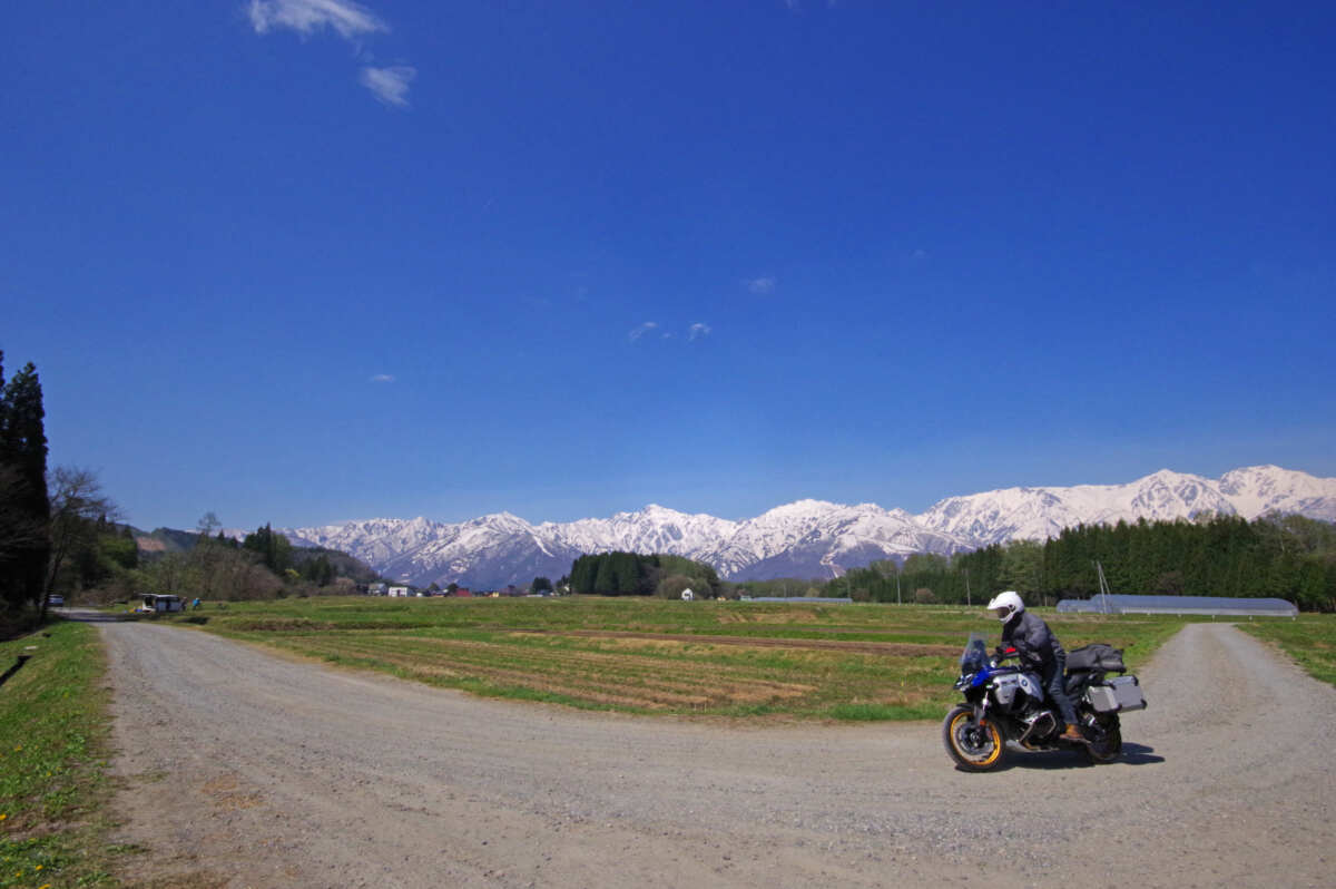 で、企画トビラのメインカットとなったのがこの一枚。松川と姫川の間の白馬村北城地区からの「絶景走り」(絶景とバイクの走っている写真を一枚に収めた写真)だ。