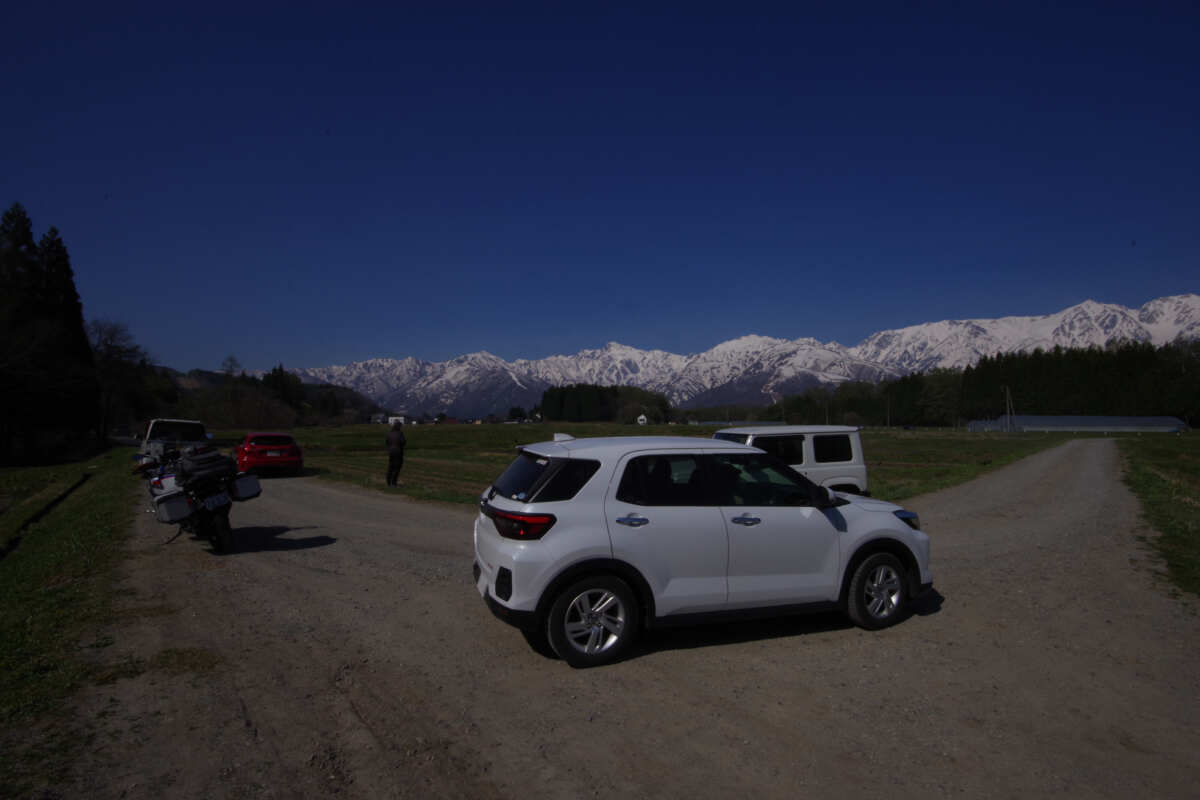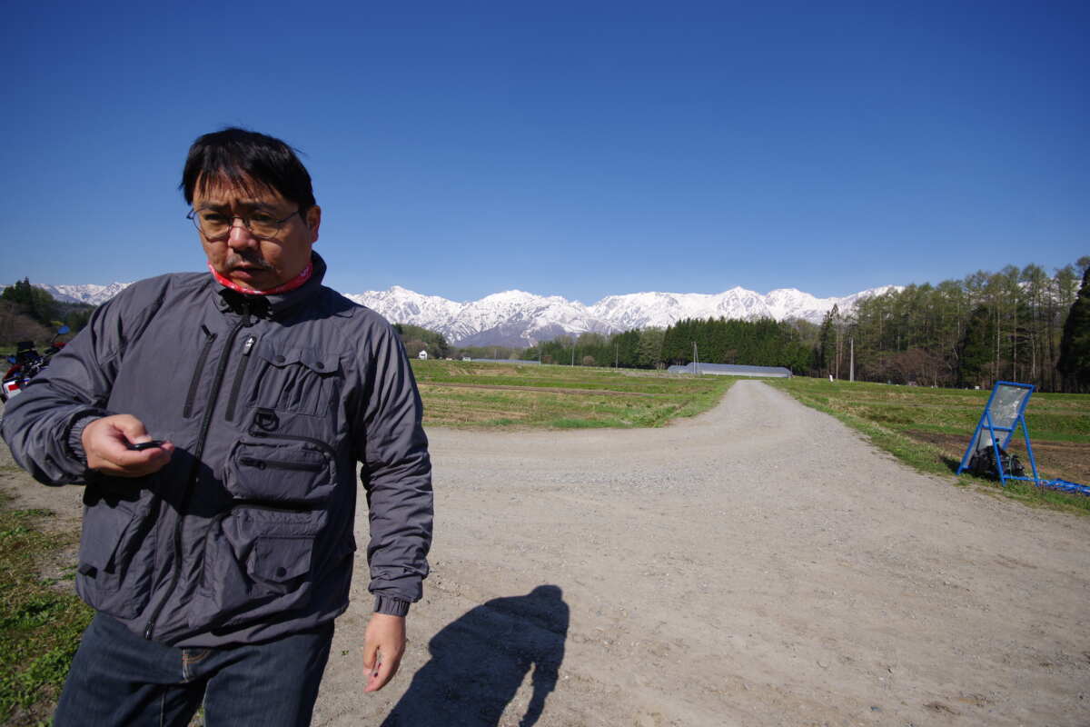 何せここは白馬村。北アルプスの山々には真っ白な雪が残っていて、これはさまざまな雪形(ゆきがた)も見せてくれるほどの美しさ。この雪山を真っ白に飛ばしてしまわないようにとにかく露出アンダー(適正露出より暗く写す)で撮りまくる。アンダーで撮っておいて、後日、フォトショップなどの画像ソフトで明るく起こせば(補正すれば)よいのだ。実際にどれくらい暗く写っているのかは確認できないんだけどね…。