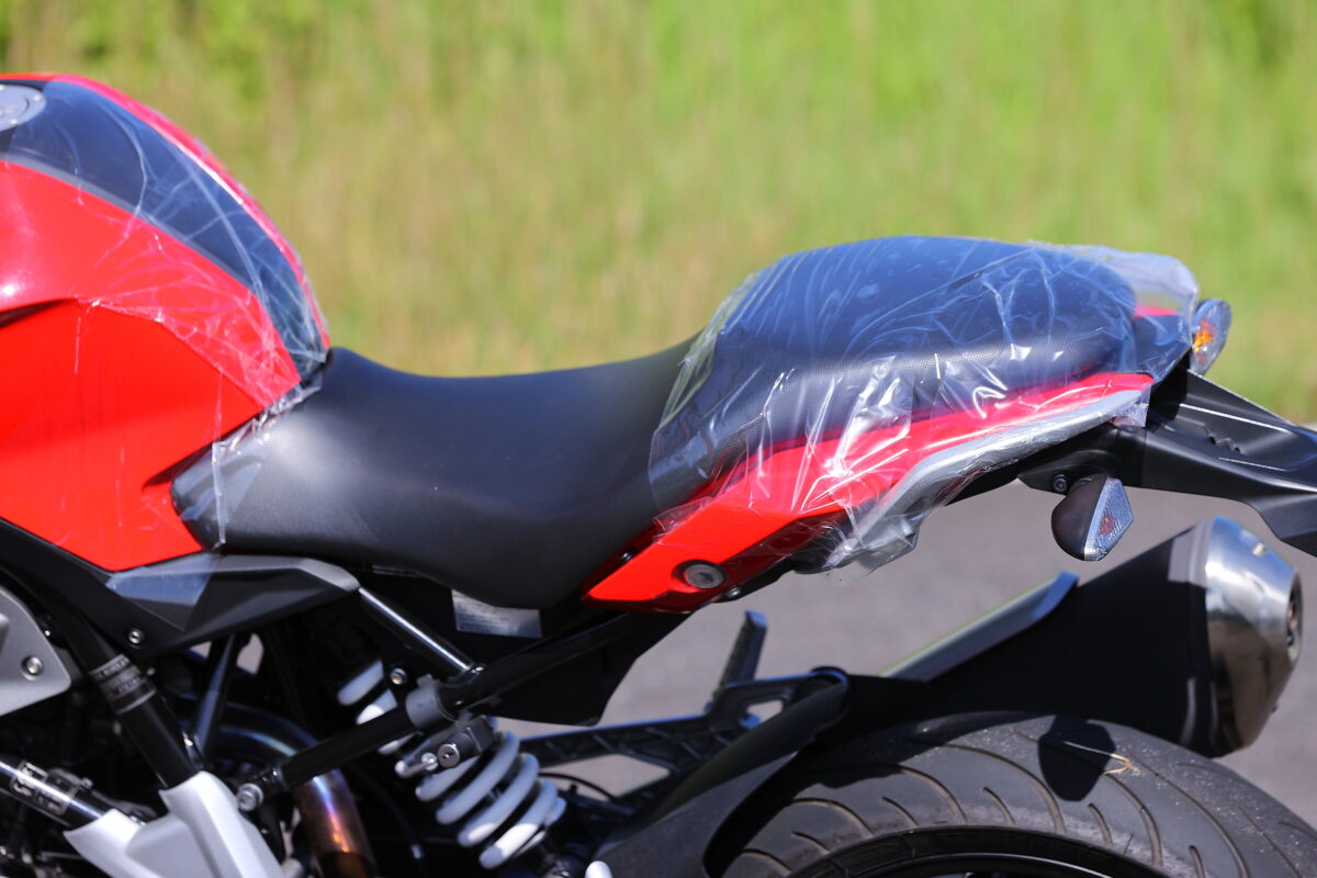 「大事な試乗車を傷つけたらどうしよう?」と心配な方も多いだろう。外国車試乗会ではタンクやシートカウルなど、傷つけやすい箇所にはあらかじめ保護テープで養生されている。特に外国車には大柄なモデルも多いので、慣れない人でも安心できるはず。