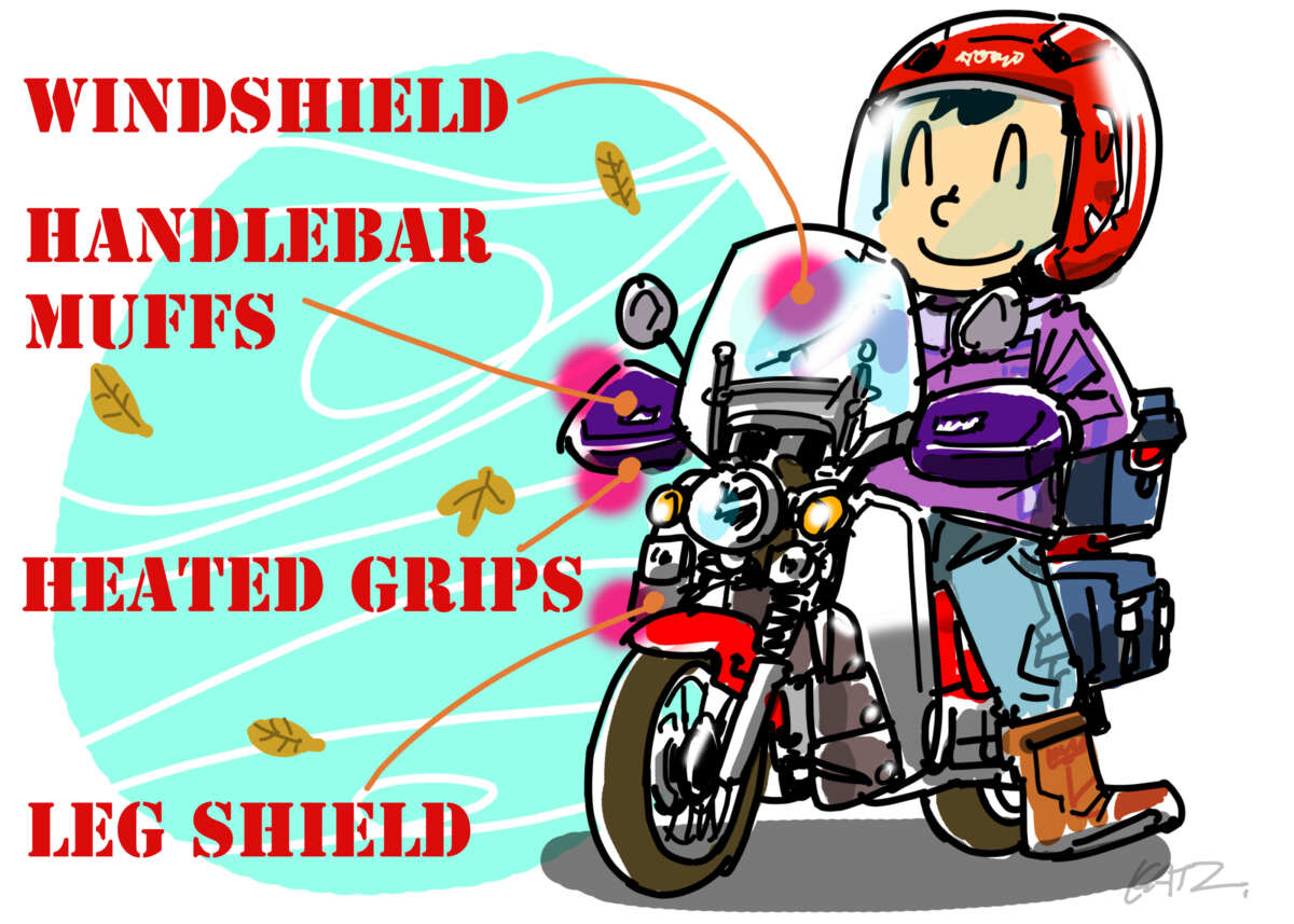 走行風を防ぐカスタムも防寒対策として有効だ。カウルがあるだけで、ネイキッドよりは寒さがマシになる。カブなどの実用車なら、大型風防やハンドルカバーを取り付けるのも悪くない。オフ車ならナックルガードを使えば、指先に当たる風を半減でき、防寒効果が得られる。ドレスアップを兼ねた防寒カスタムを楽しむのもいいものだ。