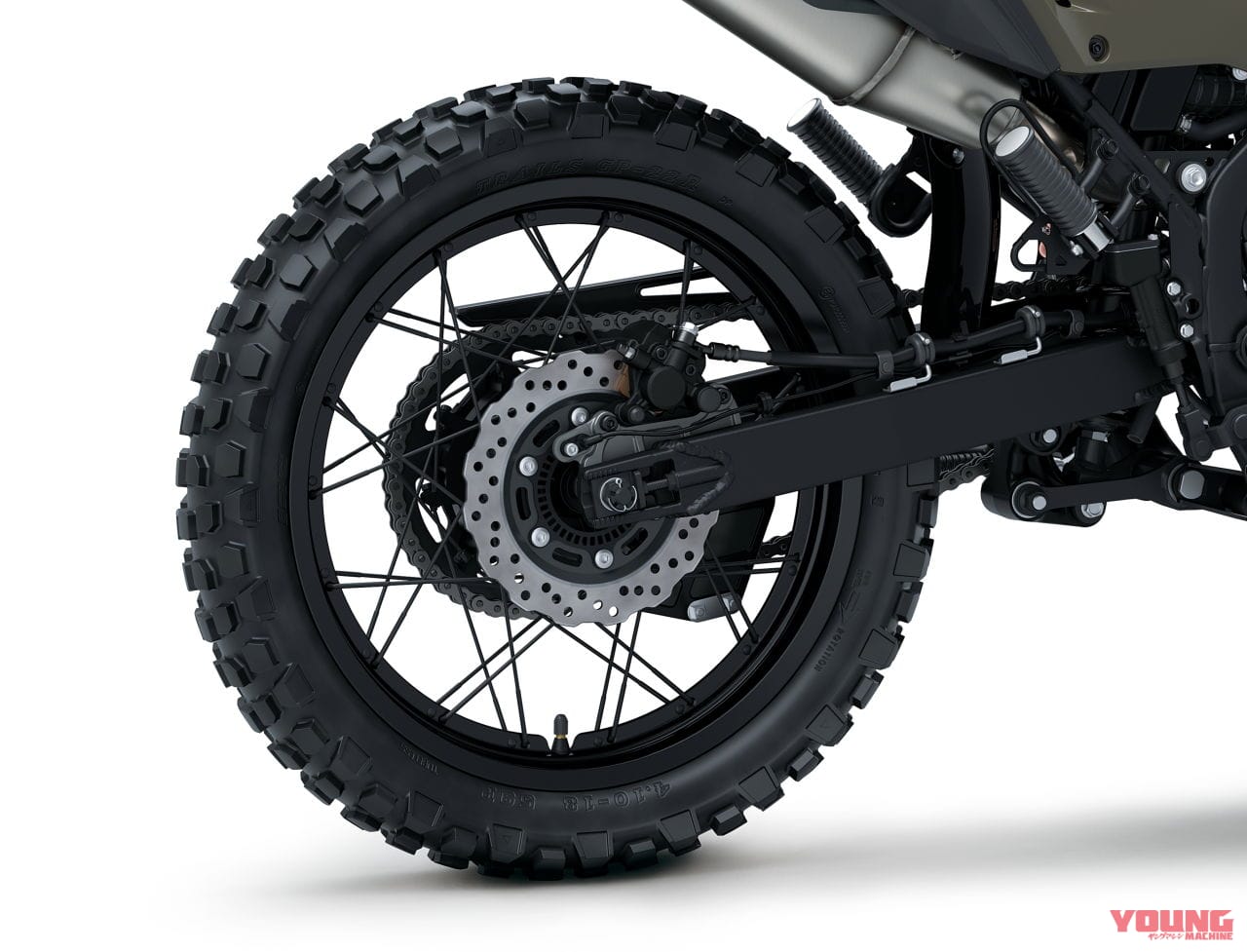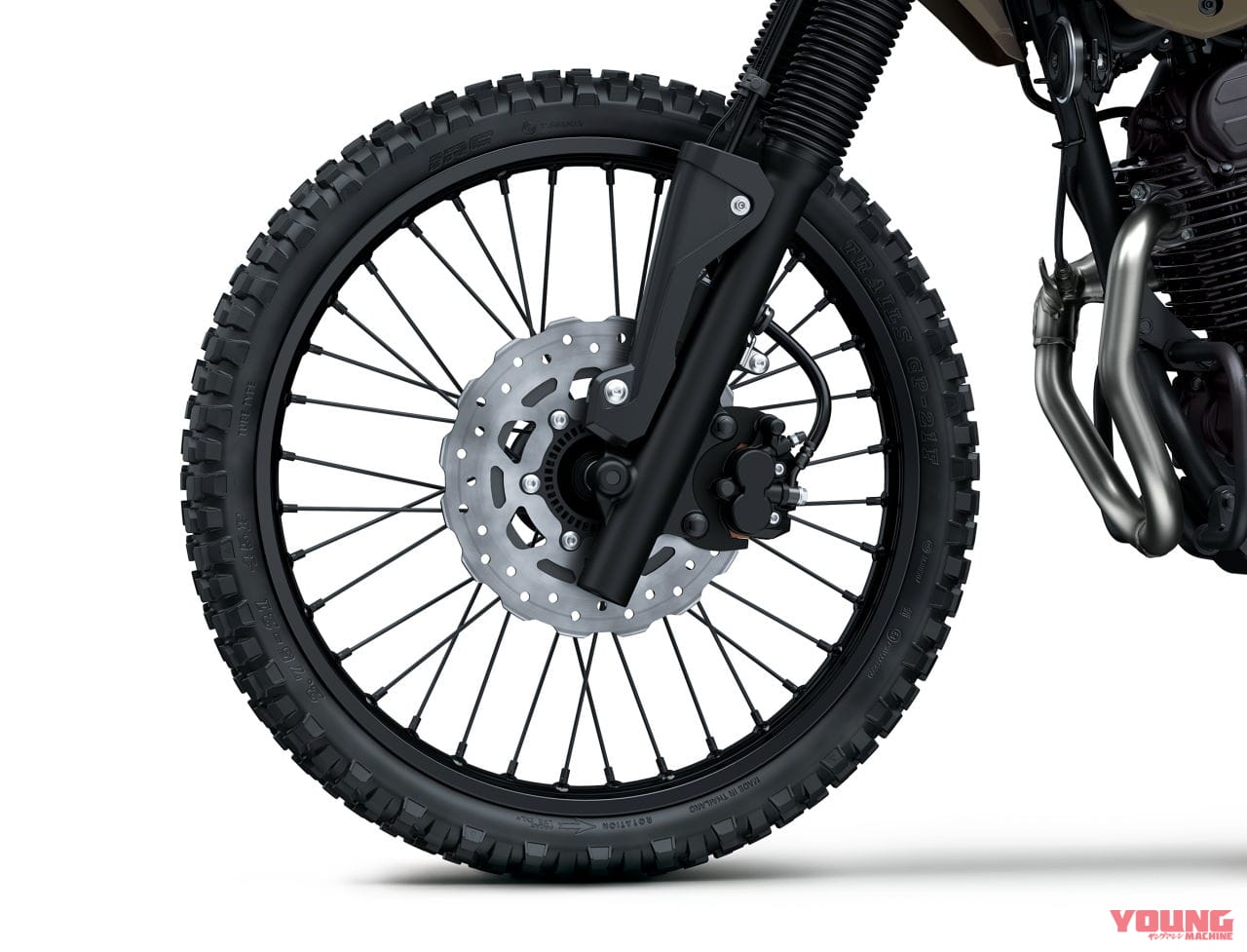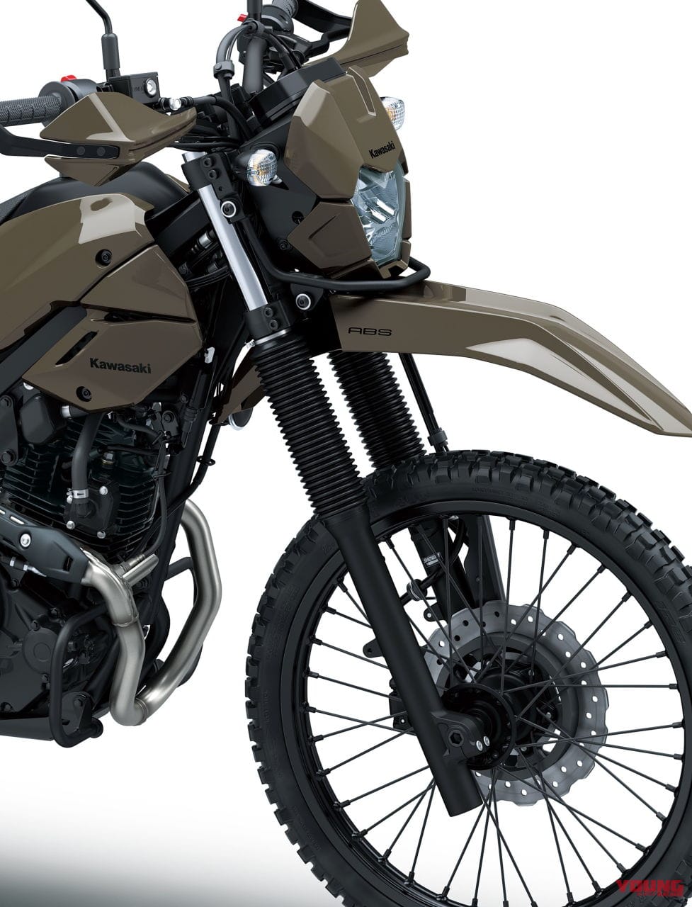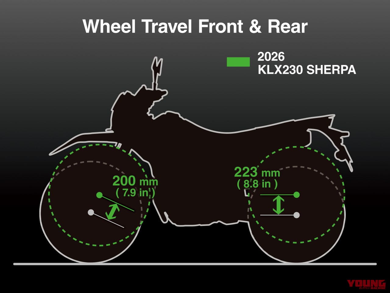 ホイールトラベルは200mm台をキープ。2025年型シェルパやKLX230Sと同等の走破性を期待できそうだ。