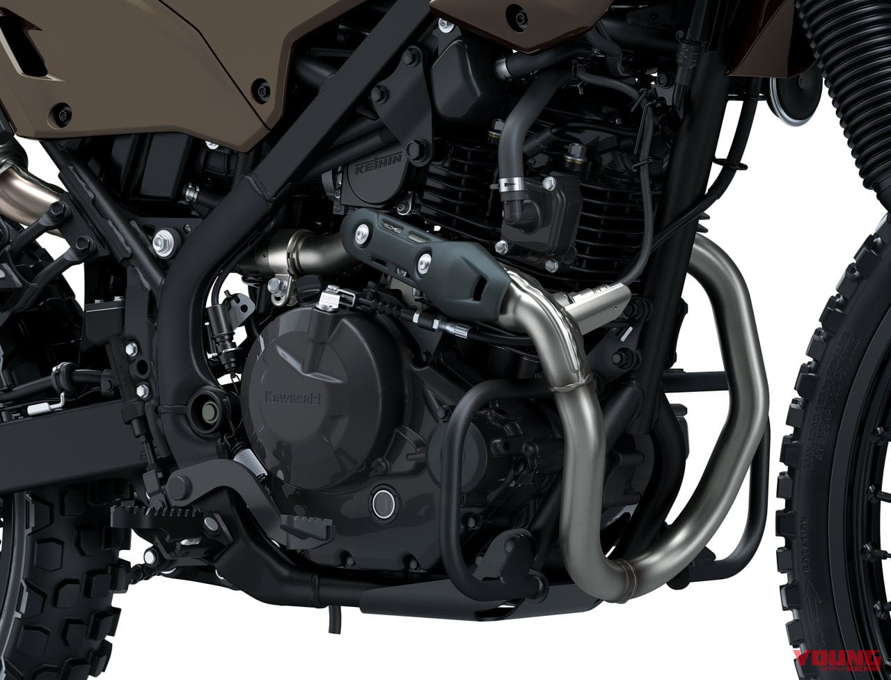 エンジンはKLX230シリーズに共通する空冷232cc単気筒を搭載し、フレームはカワサキで長年にわたって実績のあるペリメター構造のセミダブルクレードル、前後サスペンションはオーソドックスな造りながら、リアにはニューユニトラック式を採用し、前200mm/後223mmのホイールトラベルも確保。