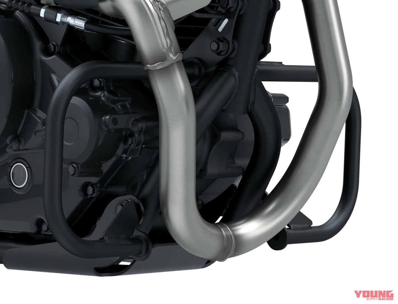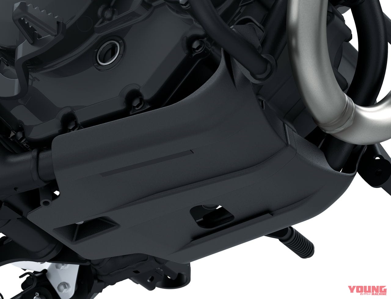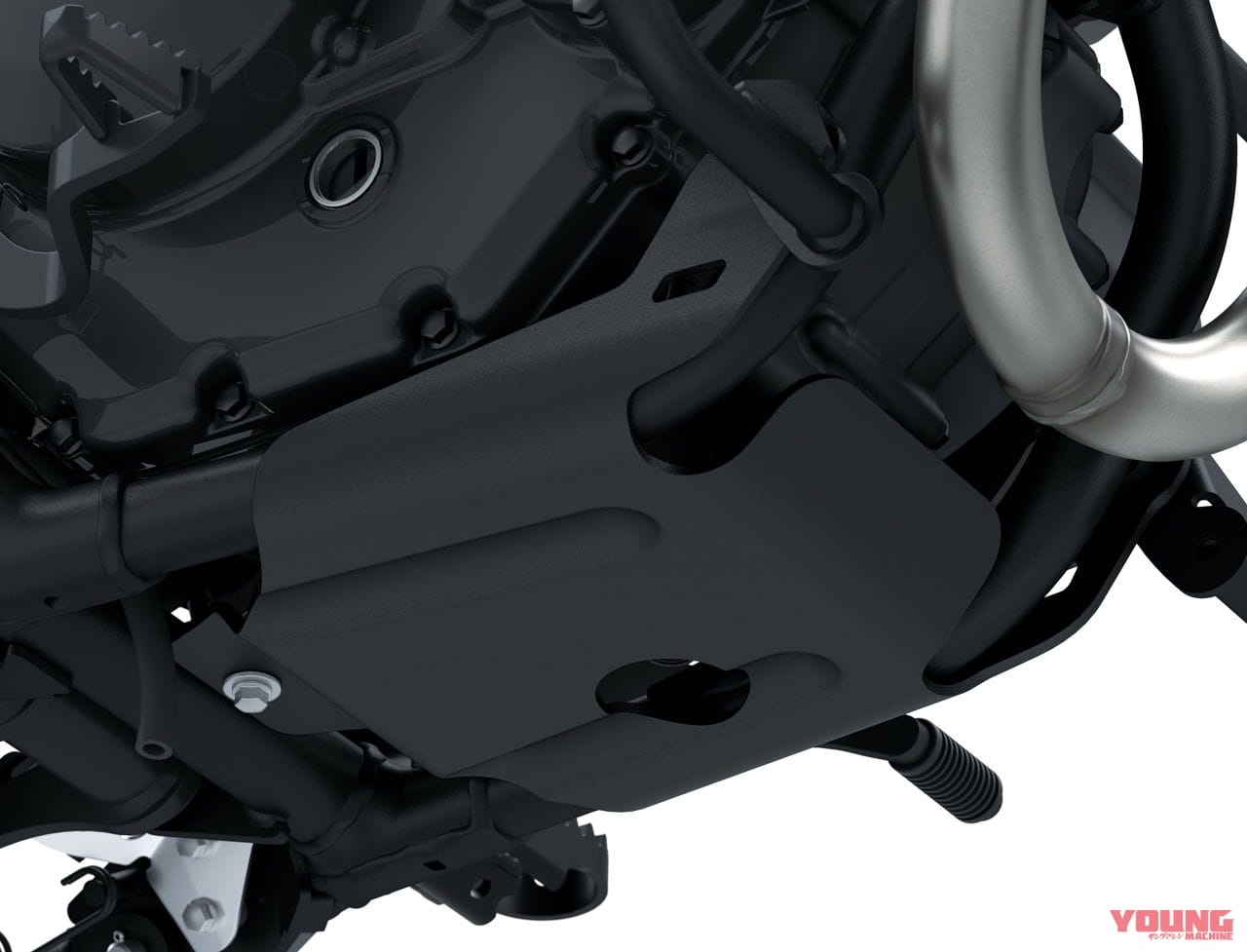 エキゾーストパイプを左右から守るようにパイプ製のエンジンガードを、またクランクケース下にはスキッドプレートを追加装備。ともにブラックアウトされている。
