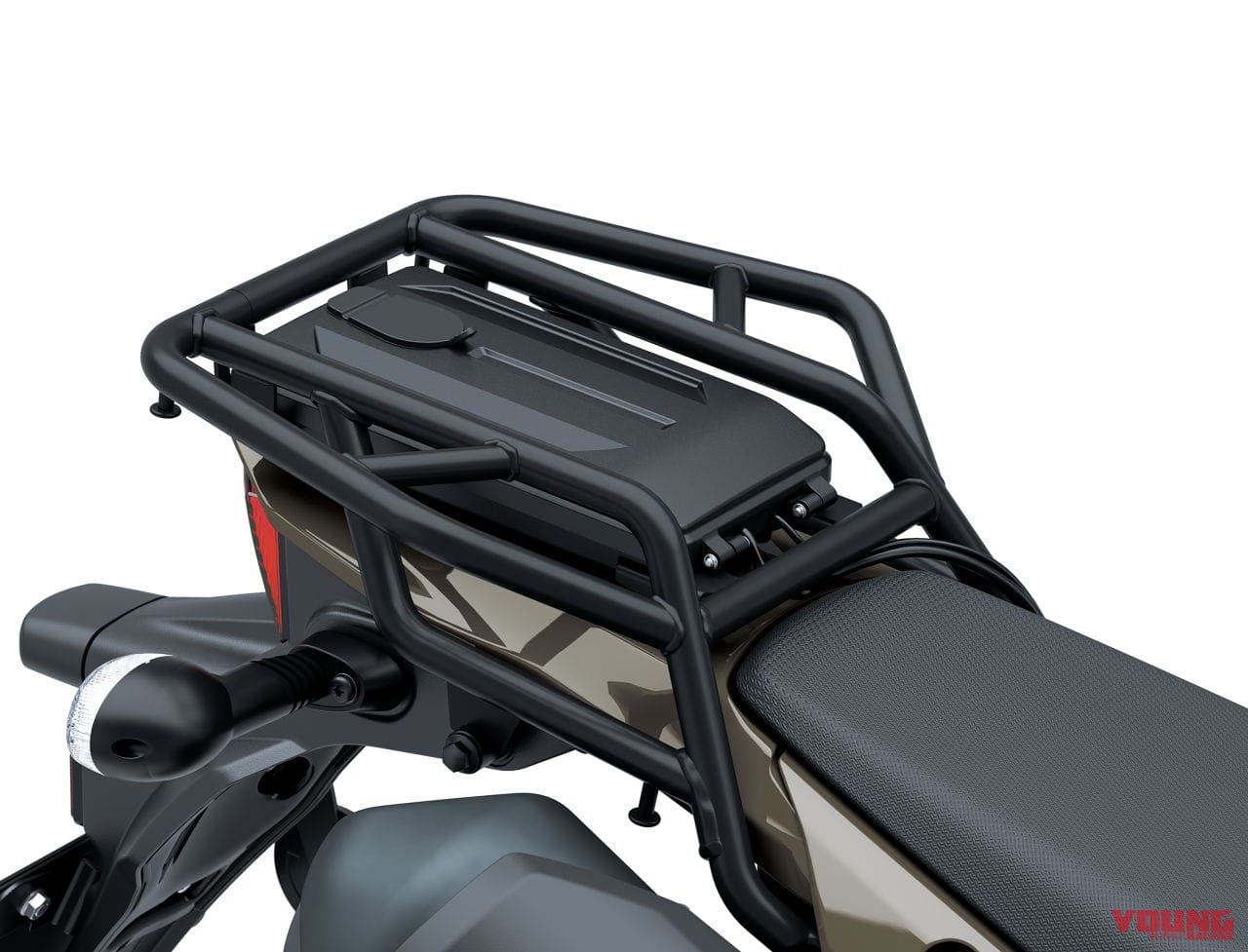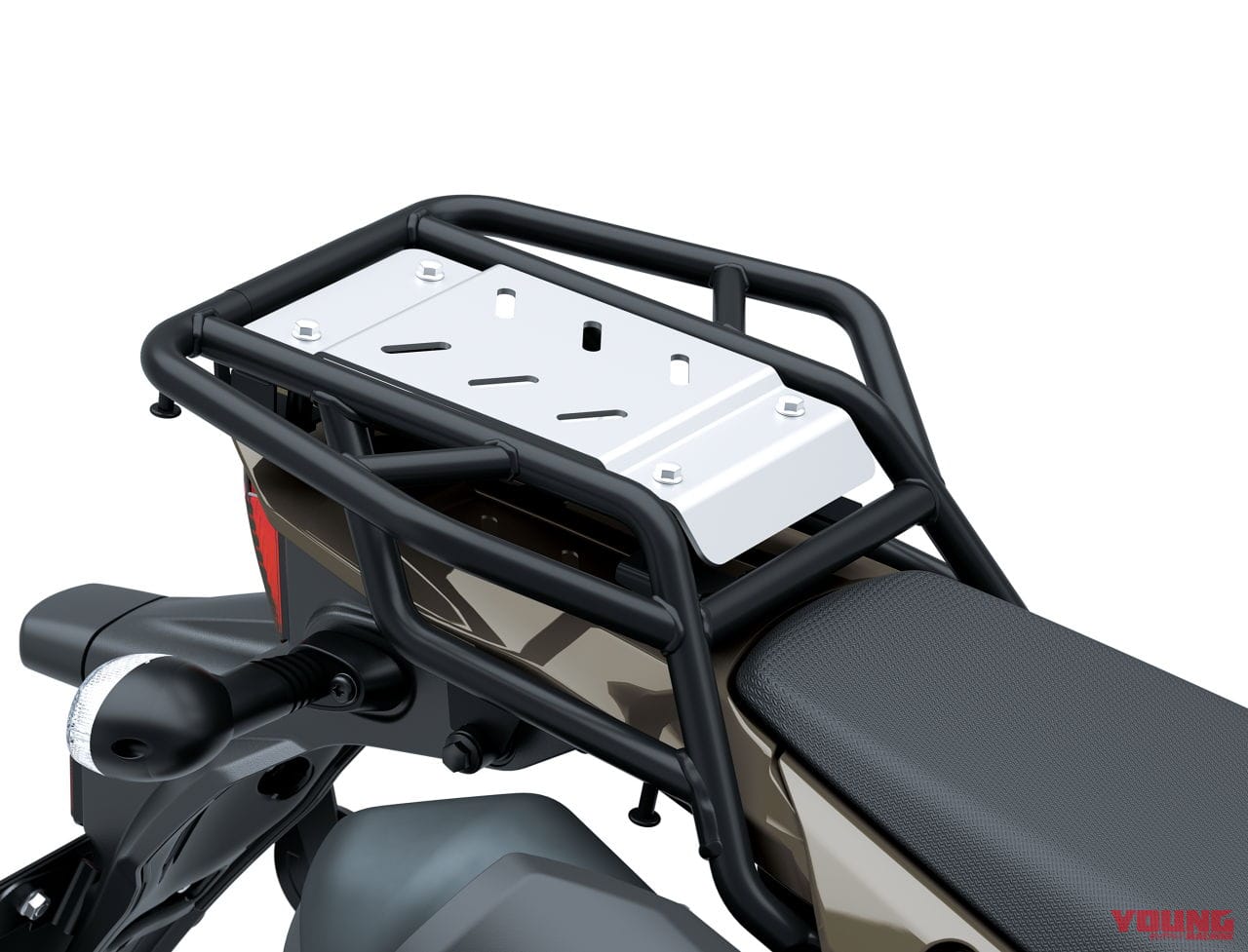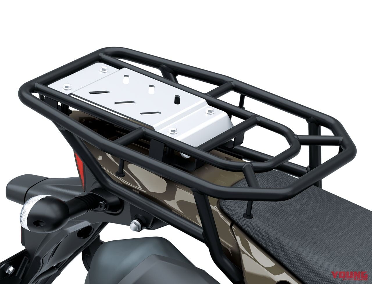 大型のヒートガードでタンデムや荷物積載も安心。シェルパではオプションのリアキャリアをDFでは標準装備に。
