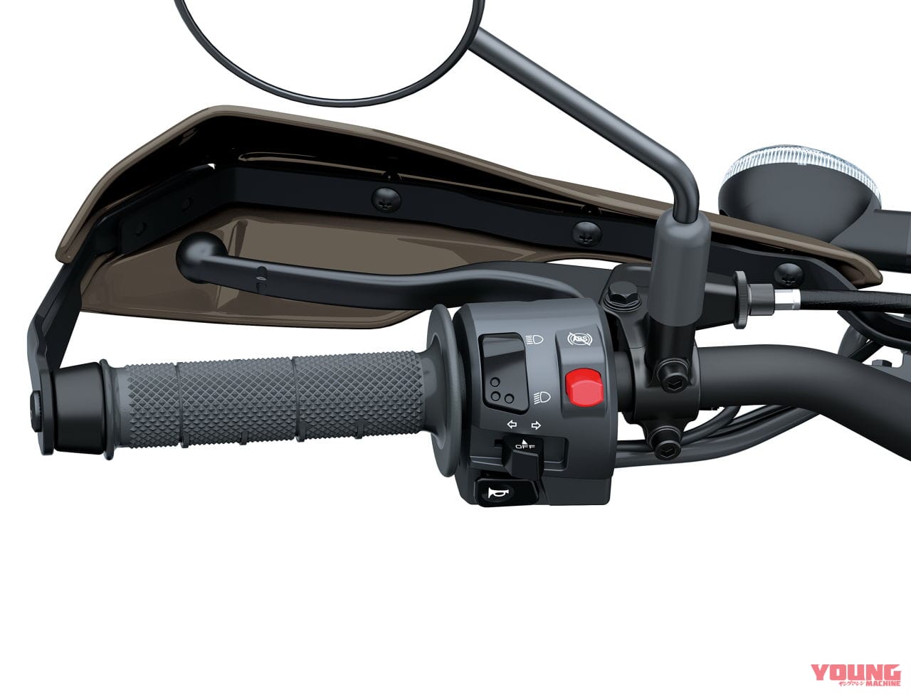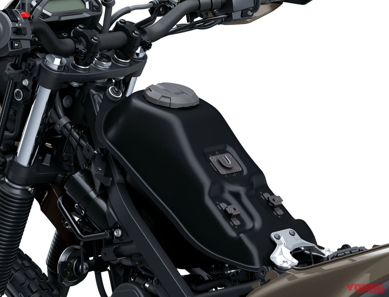 外装はグレー系のアースカラーとし、エンジンやフレーム、スイングアームなどをブラックアウトすることで、まるで自衛隊車両のようなヘビーデューティな外観を手に入れた。シュラウドのロゴは「Kawasaki」のみのシンプルなデザインになり、タフ感をアピールする。