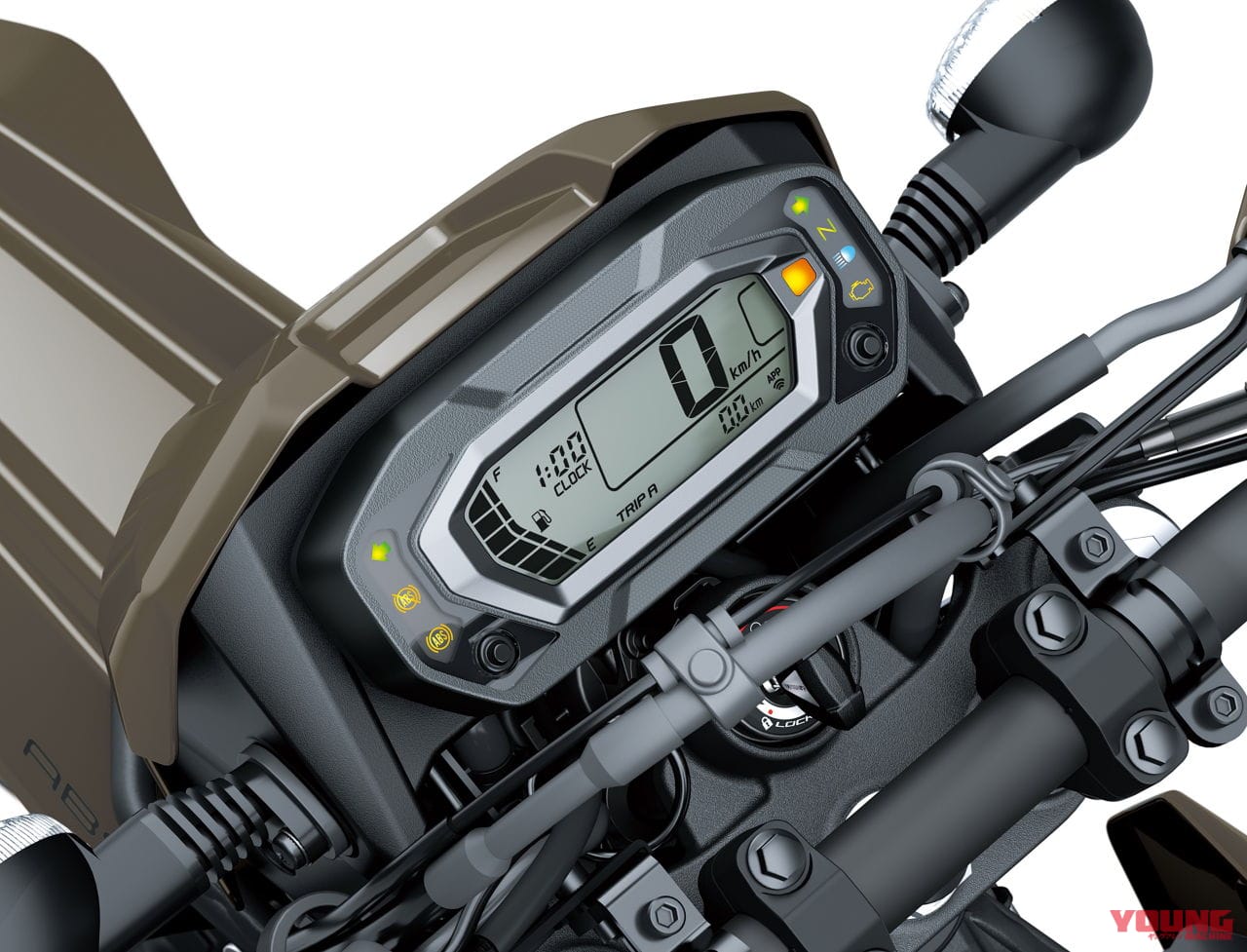 シンプル&コンパクトなLCDメーターを採用。新たにスマートフォンアプリ「RIDEOLOGY THE APP MOTORCYCLE」の「音声コマンド」、「ナビ機能」が利用可能になった(有償)。