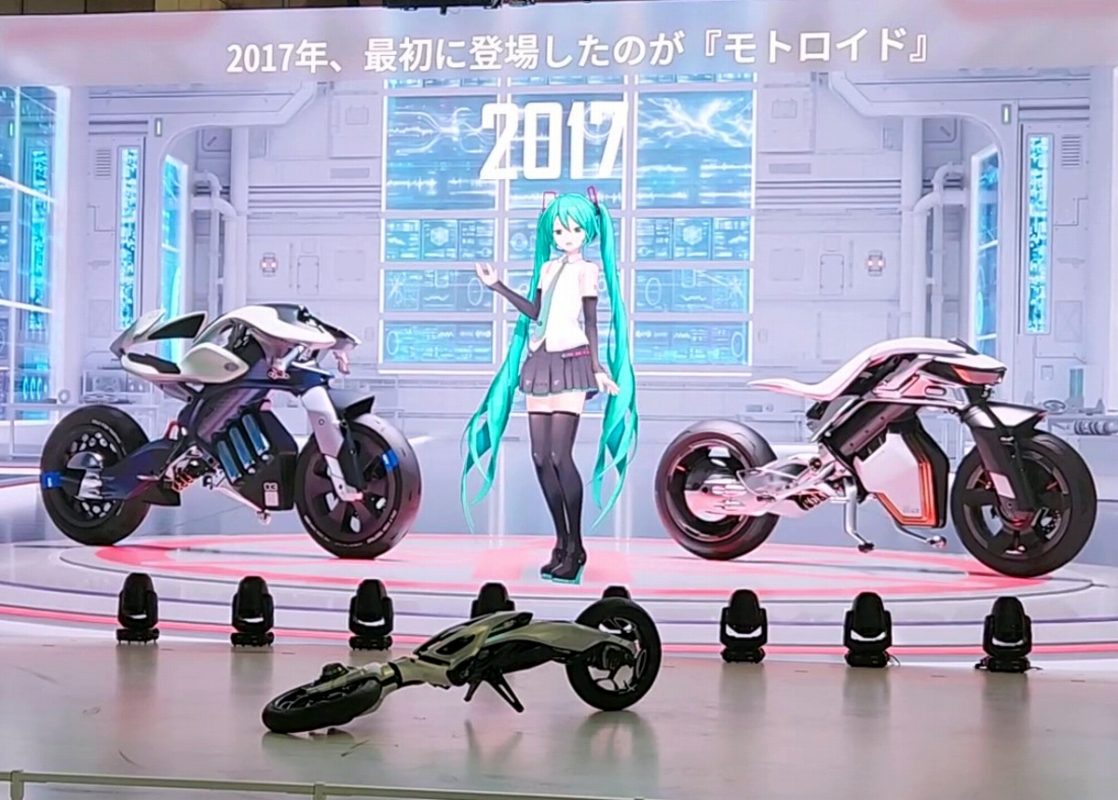 ↑モトロイドのステージでは、またも初音ミクが解説。2017年の東京モーターショーで初代(写真左)が公開され、2023年のモビショーで第二世代となる モトロイド 2(右)が発表された。今回のラムダは第3世代となる。