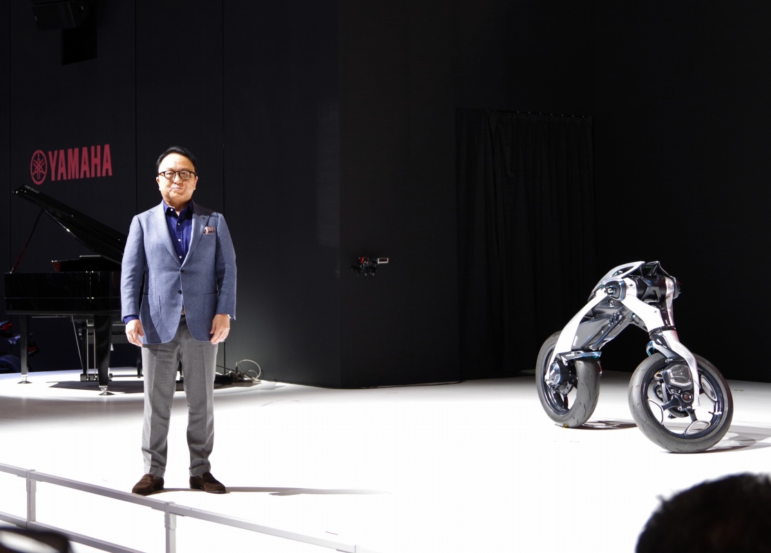 ↑プレスカンファレンスで登場したヤマハの設楽社長。その背後にたたずむ不思議な物体がモトロイドラムダ(後述)。