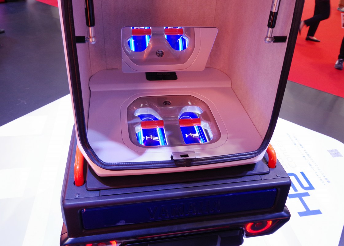 H2バディポーターコンセプトは、水素エンジンと車体をヤマハが開発。トヨタが2輪用に開発した認可取得済みの小型高圧水素タンクを燃料に走行する。