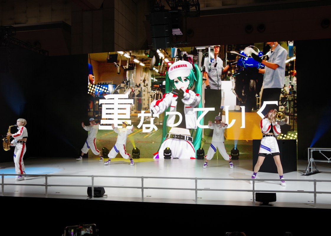 ↑作業着姿の初音ミクがスクリーンに登場し、ヤマハ (楽器の方)のSound xRによる音響と、管楽器グループがショーを披露。