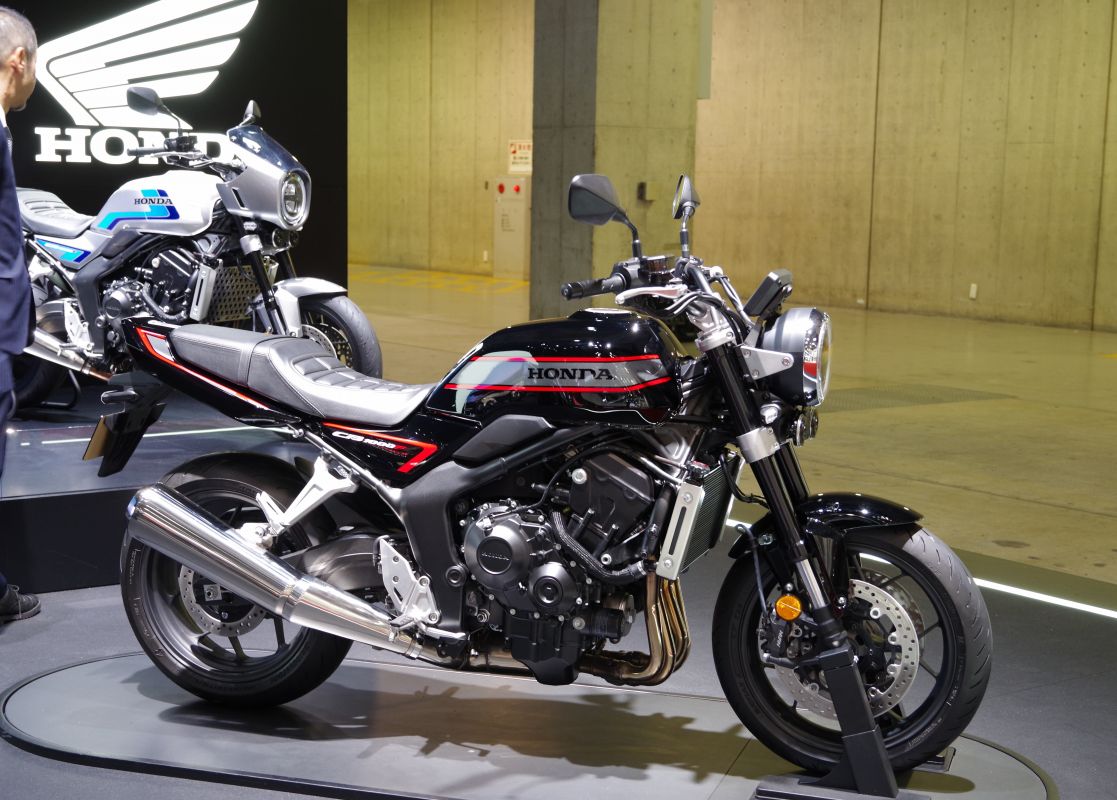 ↑11月に発売されたCB1000FはまたがりOK。来年2月発売のビキニカウル付き「SE」とモリワキレーサーも展示されていた。