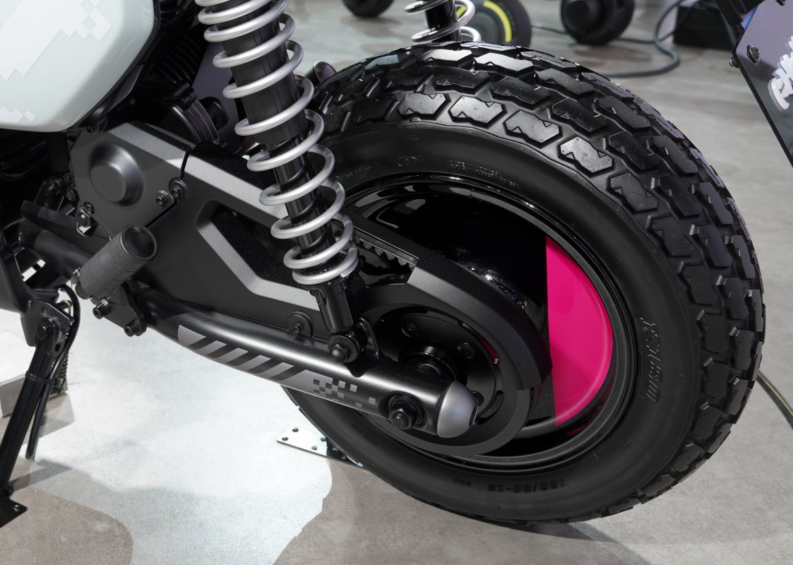↑元祖のバルーンタイヤは絶版なので、12インチに黒いディッシュホイールでタイヤを太く見せている。駆動方式はEVやこのサイズでは珍しいベルトドライブだ。