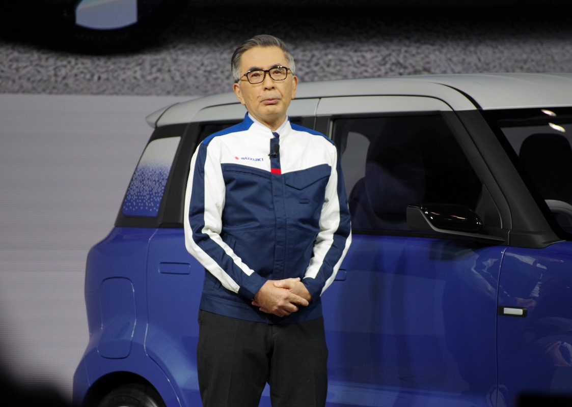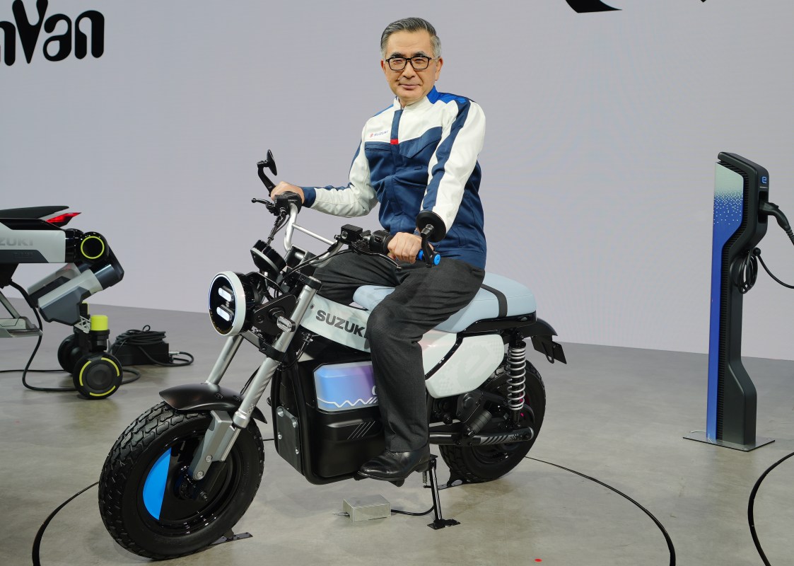 ↑e-バンバンとスズキ社長の貴重なツーショット! 社長の身長は調べてもわからなかったが、eバンバンはかなりコンパクトなようだ。