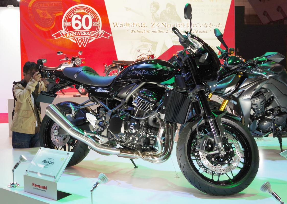 ↑ビキニカウルやローハンドルを備えたZ900RSカフェの新型。こちらも2026年2月発売で154万円。なお、展示されていなかったが、STD仕様のブラックボールエディションも来年2月に登場する。価格は152万9000円。