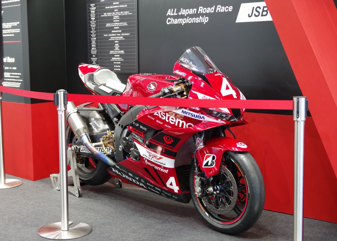 ↑Astemo(旧ニッシン、ケーヒン、ショーワ)は、全日本JSB参戦車両のCBR1000RR-Rを展示。