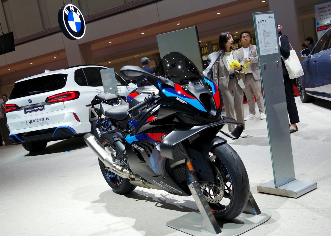 ↑BMWブースではクルマに混じって、最高峰のM1000RRと電動のCE02が展示されていた。