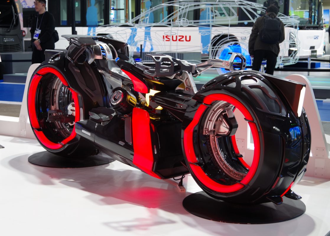 ↑映画『トロン:アレス』に出てくるバイク「ライトサイクル」も展示。電脳空間を走る、まさに未来のバイクだ。展示されたのは実際の撮影に使われた車両!(走れません!)