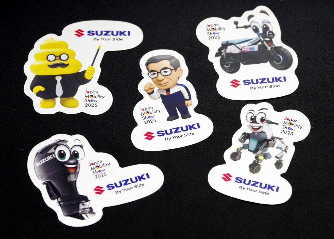 ↑スズキブースで配付されていたステッカー。社長がキャラ化されている! こんなメーカー他にないのでは? 名物社長だった鈴木修氏に続いて、トップを前に押し出していくスタイル、嫌いじゃない笑。