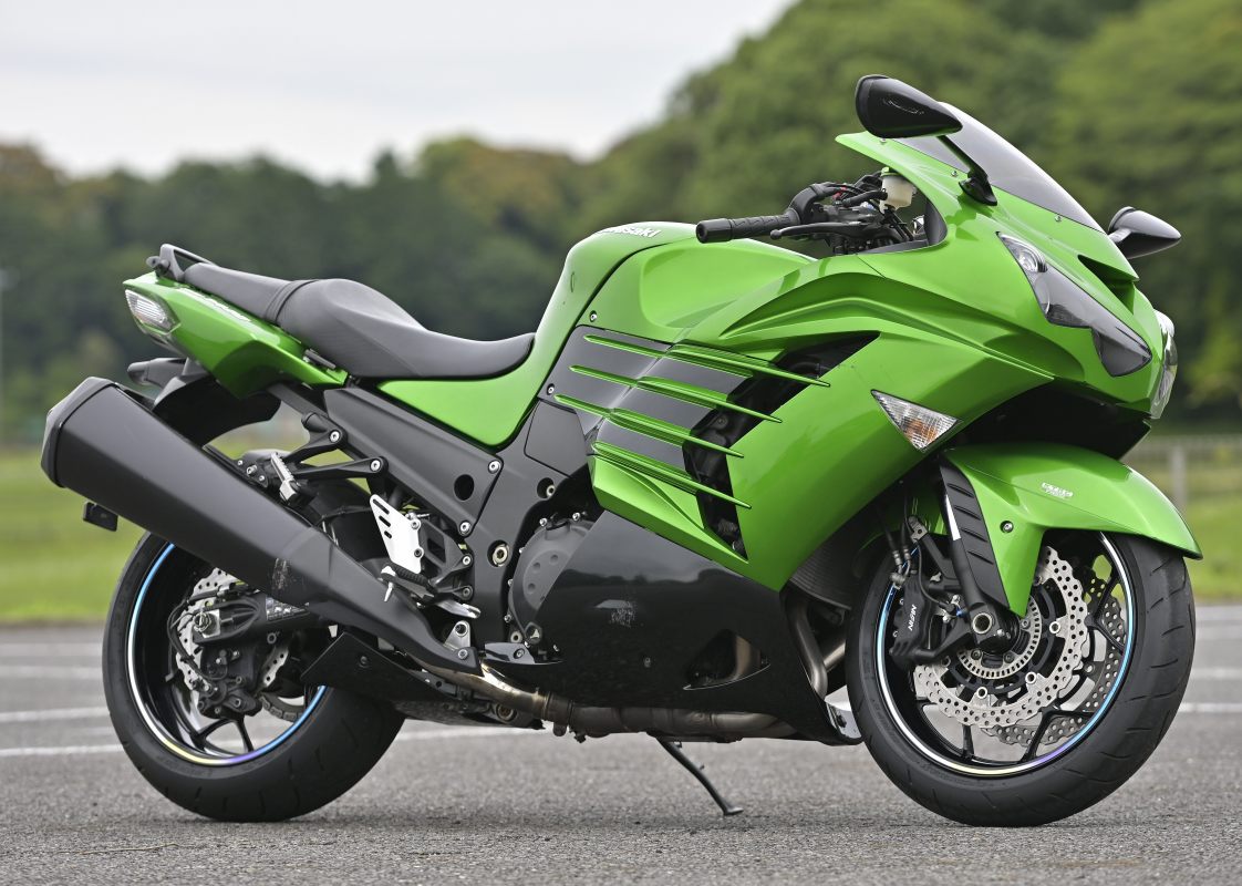 ↑'14年型ZZR1400(Ninja ZX-14R欧州仕様)。カワサキのフラッグシップとして、水冷直列4気筒は前世代の1352ccから1441ccに到達。最高出力は200ps+ラムエアを叩き出す。国内には逆輸入車として入荷してきたが、排ガス規制などの影響で2020年モデルをもって生産終了。試乗車の走行距離は2万3300km。外観、走りとも絶好調だ。