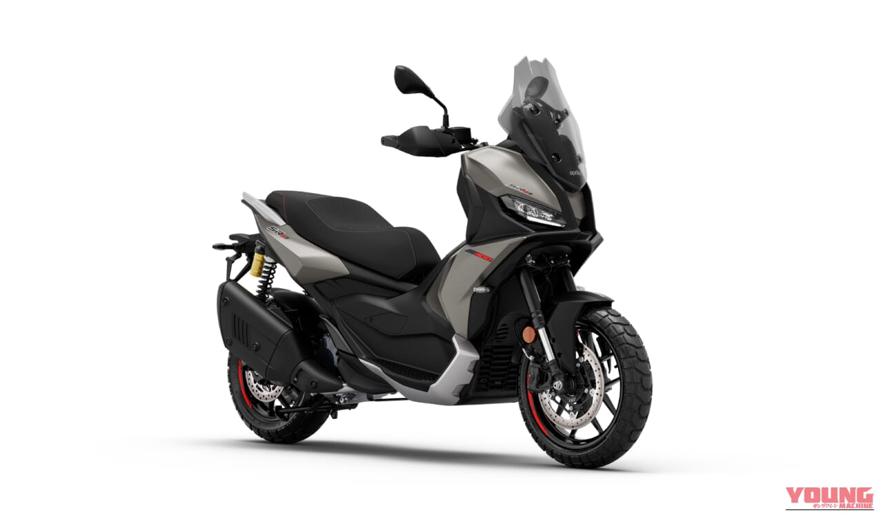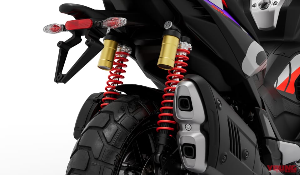 走破性を高める新設計のシャーシを備え、舗装路以外でも十分なパフォーマンスを発揮。スクータータイプながらホイールトラベル120mmを確保した、高剛性なロングストロークのテレスコピックフォーク、そして深い溝が刻まれたアドベンチャータイプの前16インチ、後ろ14インチのタイヤがその走行性能を支えている。