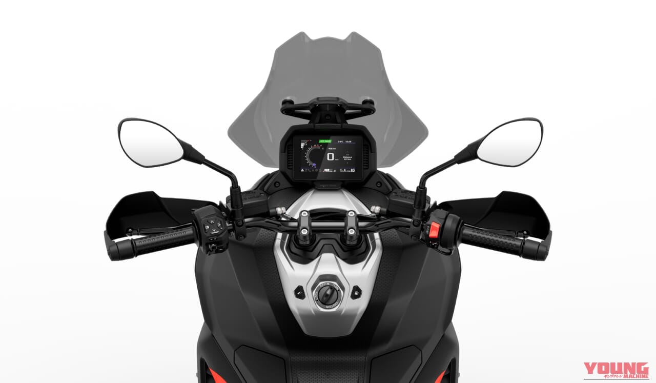 装備面も充実している。5インチTFTディスプレイ、キーレスシステム、そして調整が可能なトラクションコントロールに加え、Bosch製2チャンネルABSを標準搭載。利便性の高い装備として、シート下にはフルフェイスヘルメットやさまざまな荷物を収納できるスペースを確保し、5段階の高さに調整可能なウインドスクリーンも確保している。