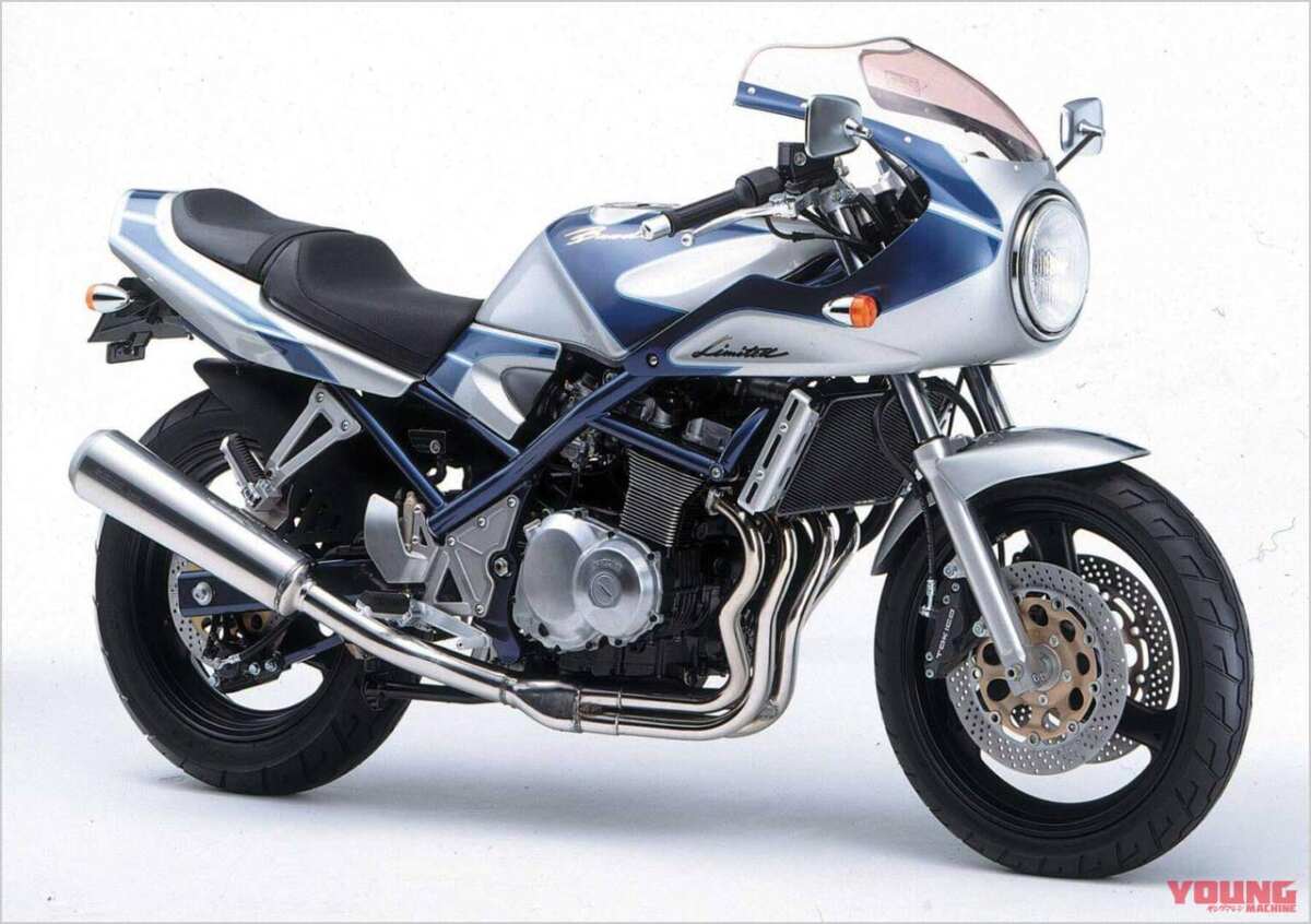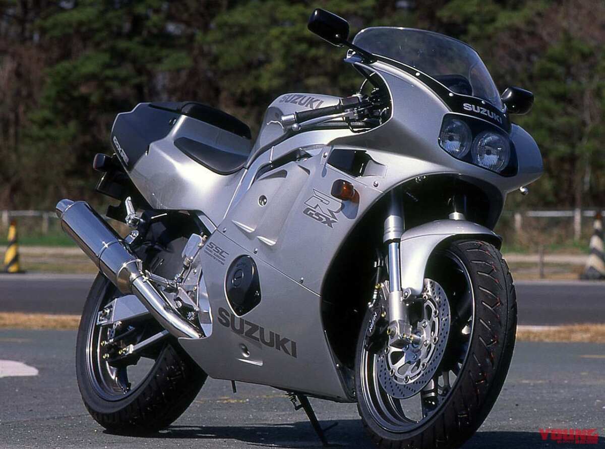 美しいパイプワークを強調したダイヤモンドフレームに、レーサーレプリカGSX-R400Rの水冷4気筒をベースに実用回転域の性能を重視したエンジンを搭載。大径の多孔式フローティングディスクや異径4POTキャリパーなどブレーキも強力。セパレートハンドルやパイプハンドル(ロー/アップ)、カウル装備車など多彩な仕様を揃えた。